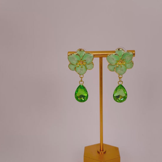 Mint-green pear stone earrings with floral detailing — fresh, feminine, and effortlessly chic.