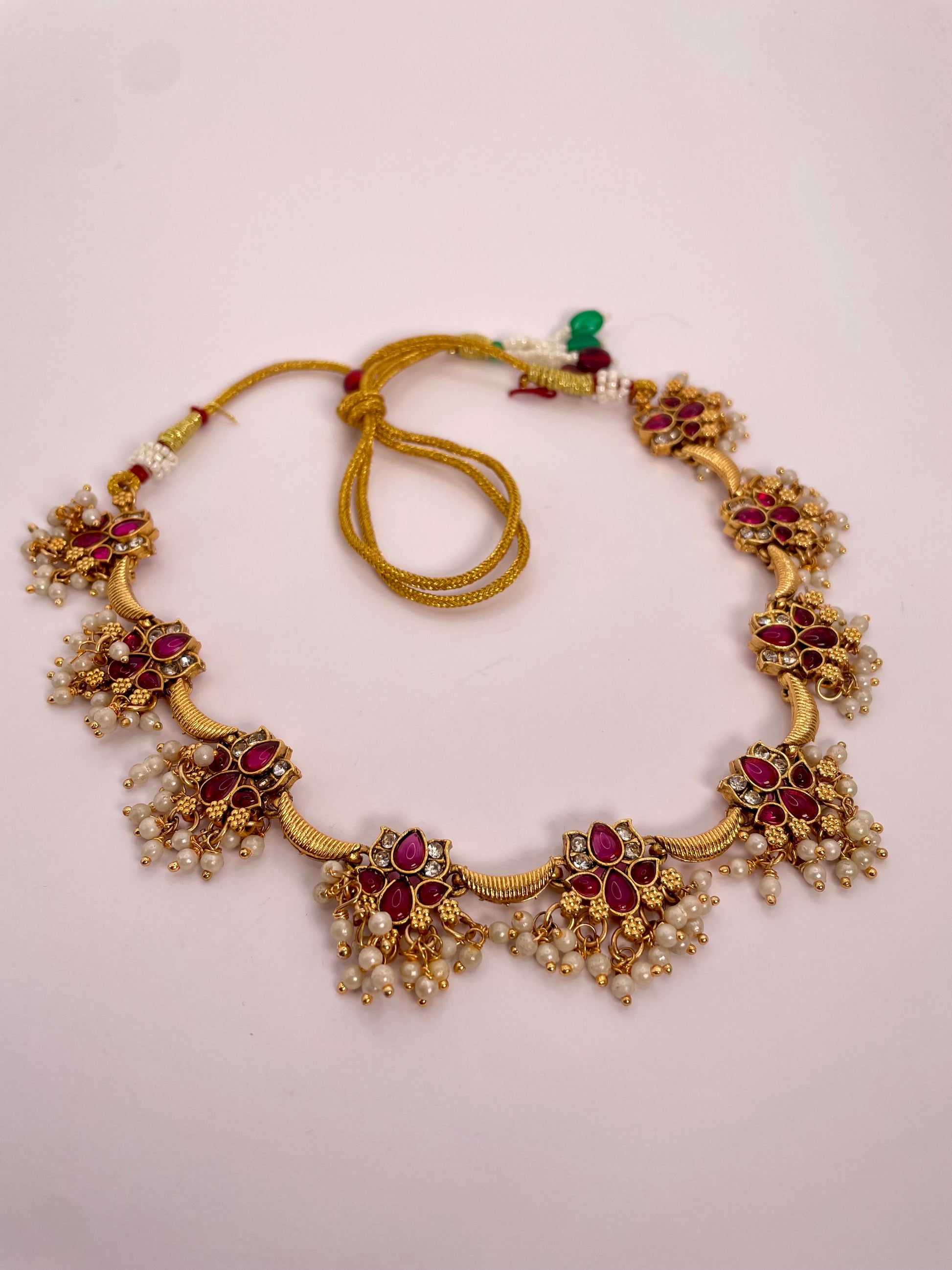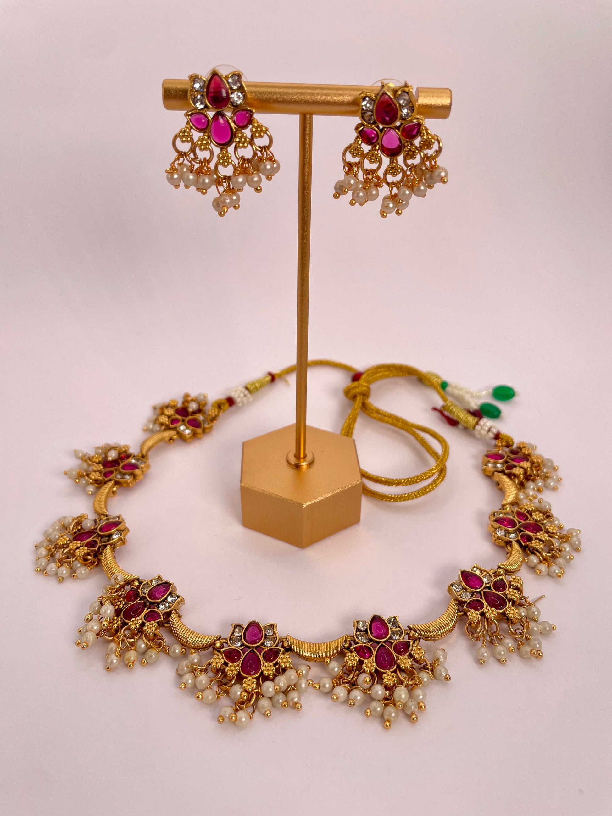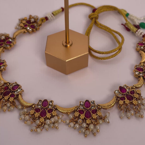 Anvika exudes elegance and tradition with its radiant ruby-red beads paired with a delicate hanging lotus motif. This necklace set is designed to make a graceful statement, while the matching earrings complete the ensemble for a cohesive, striking look. Lightweight and versatile, Anvika is perfect for festive occasions, weddings, or cultural gatherings.