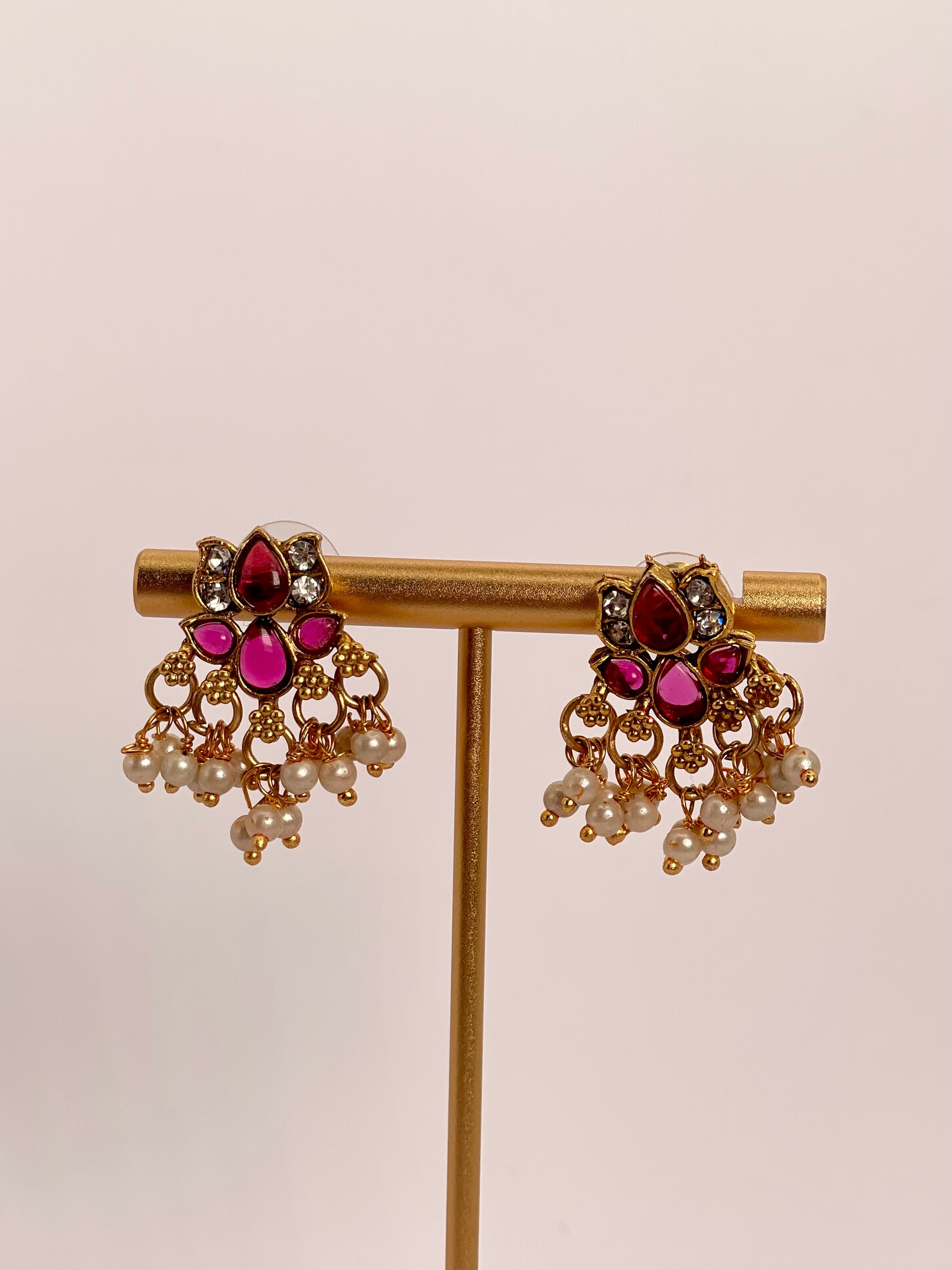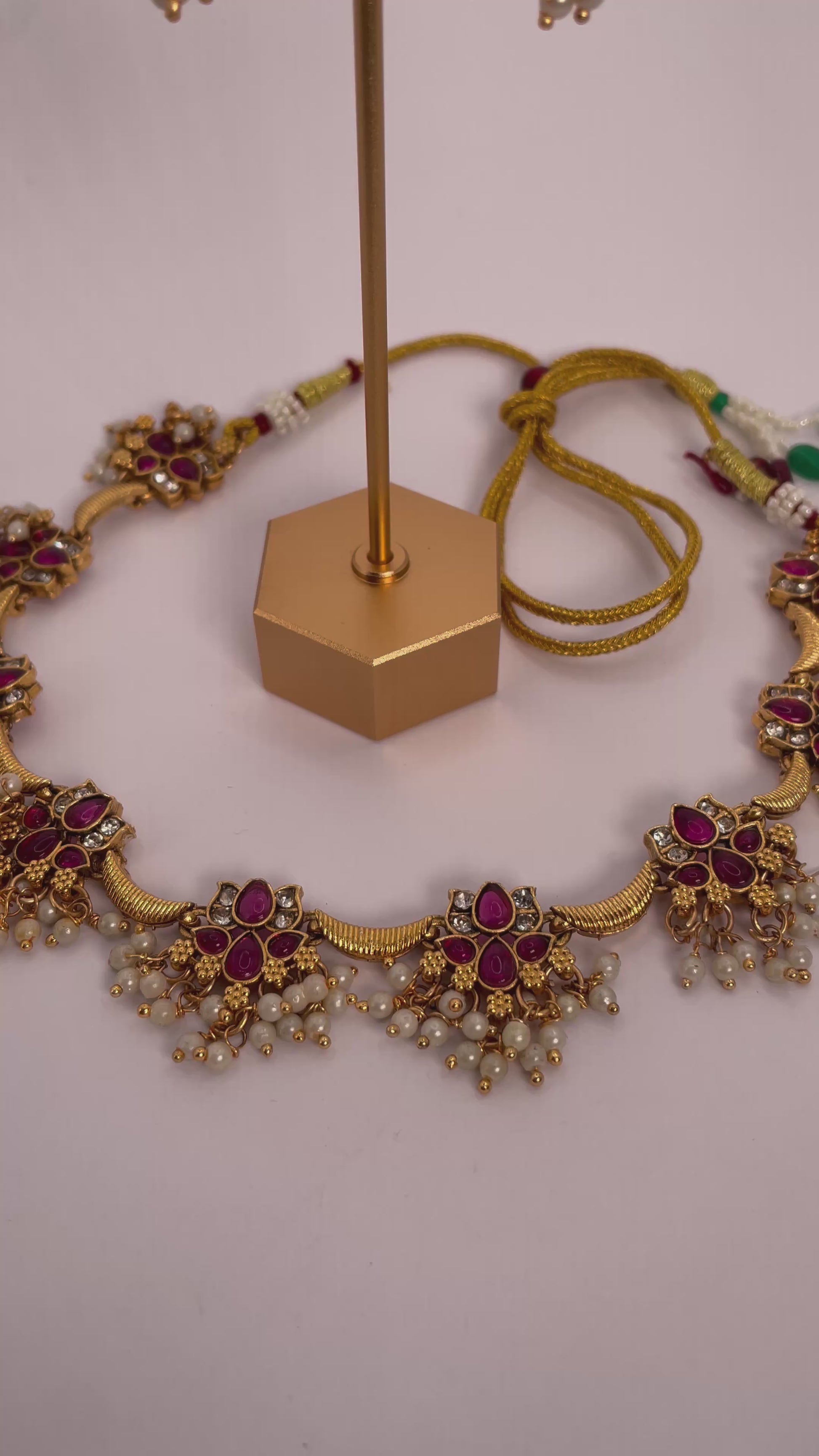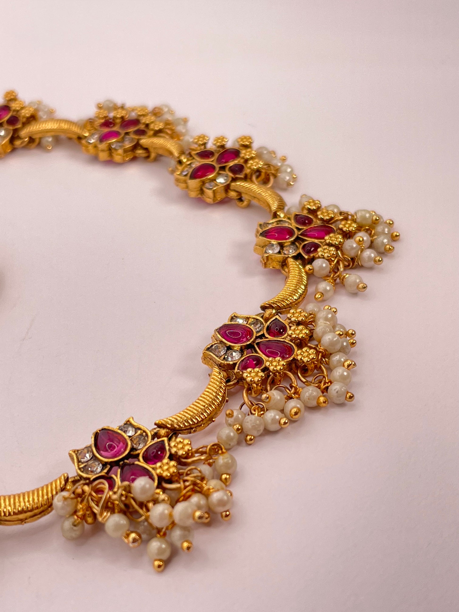 Anvika exudes elegance and tradition with its radiant ruby-red beads paired with a delicate hanging lotus motif. This necklace set is designed to make a graceful statement, while the matching earrings complete the ensemble for a cohesive, striking look. Lightweight and versatile, Anvika is perfect for festive occasions, weddings, or cultural gatherings.