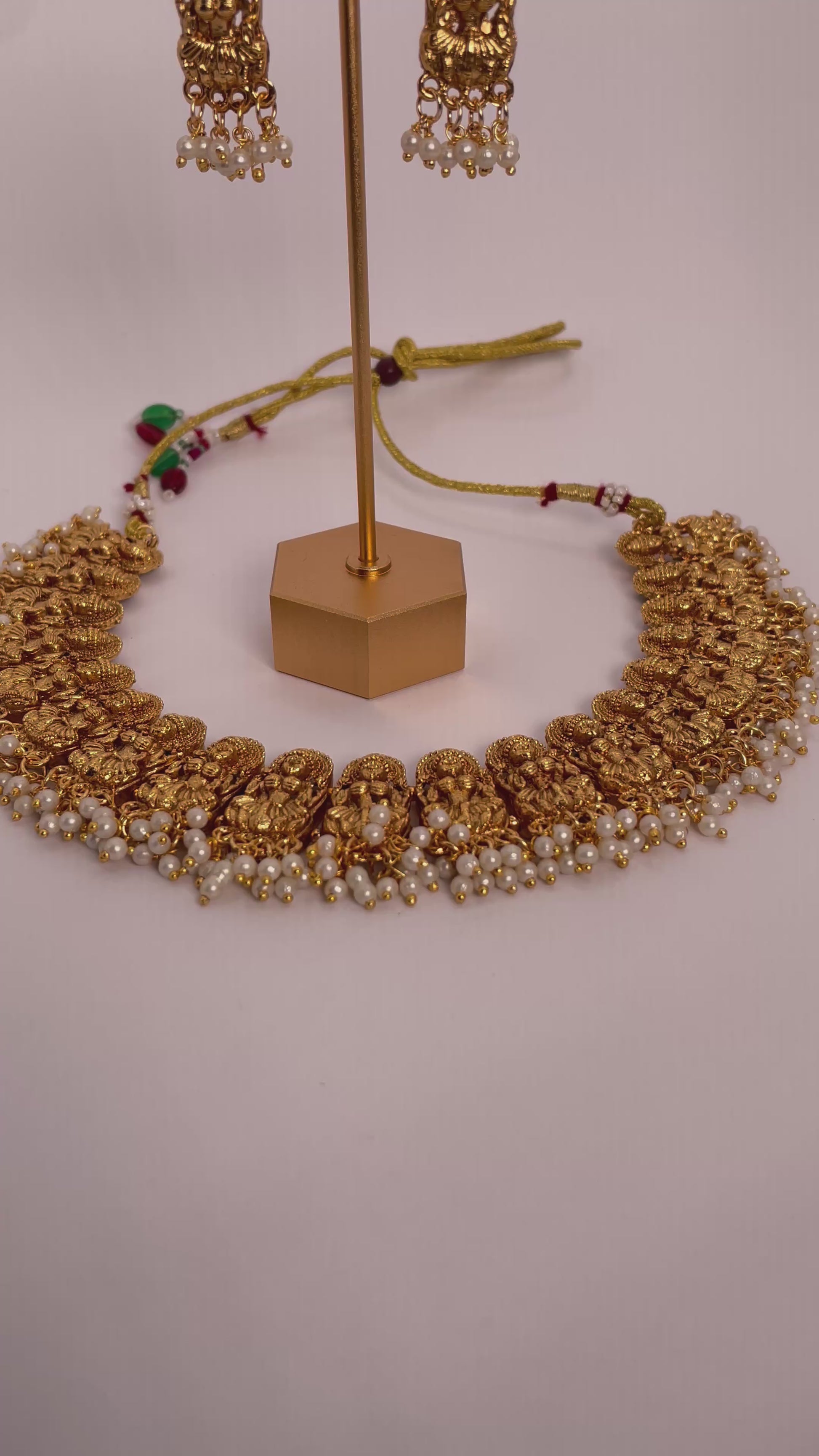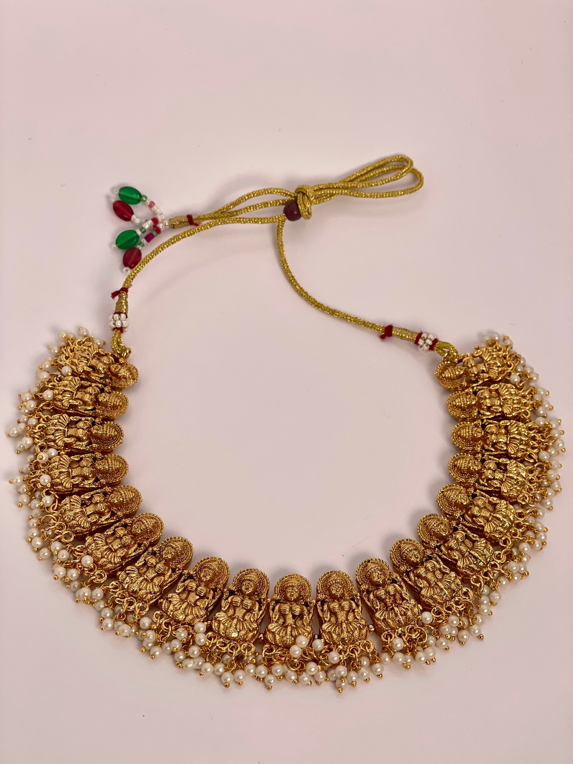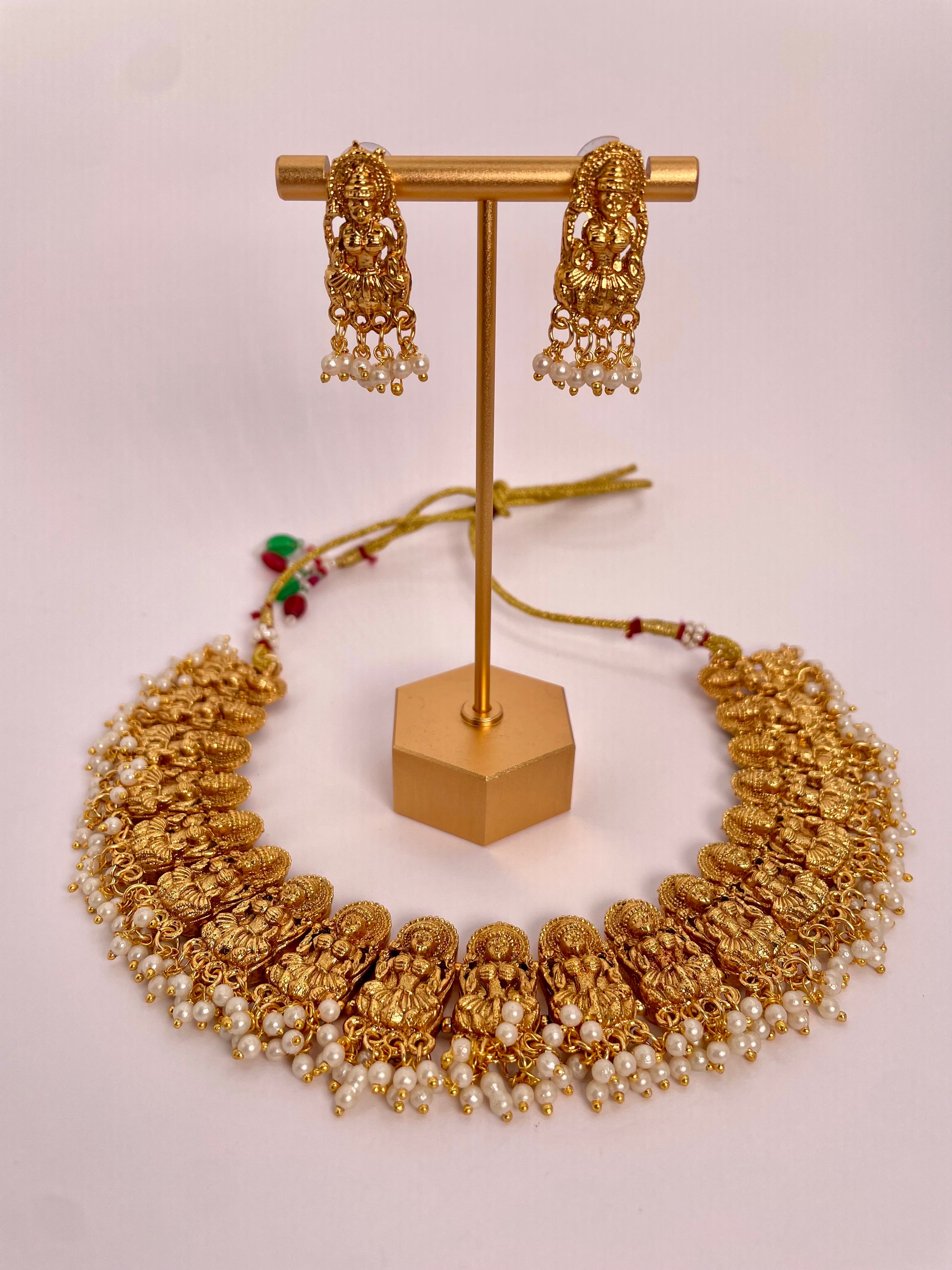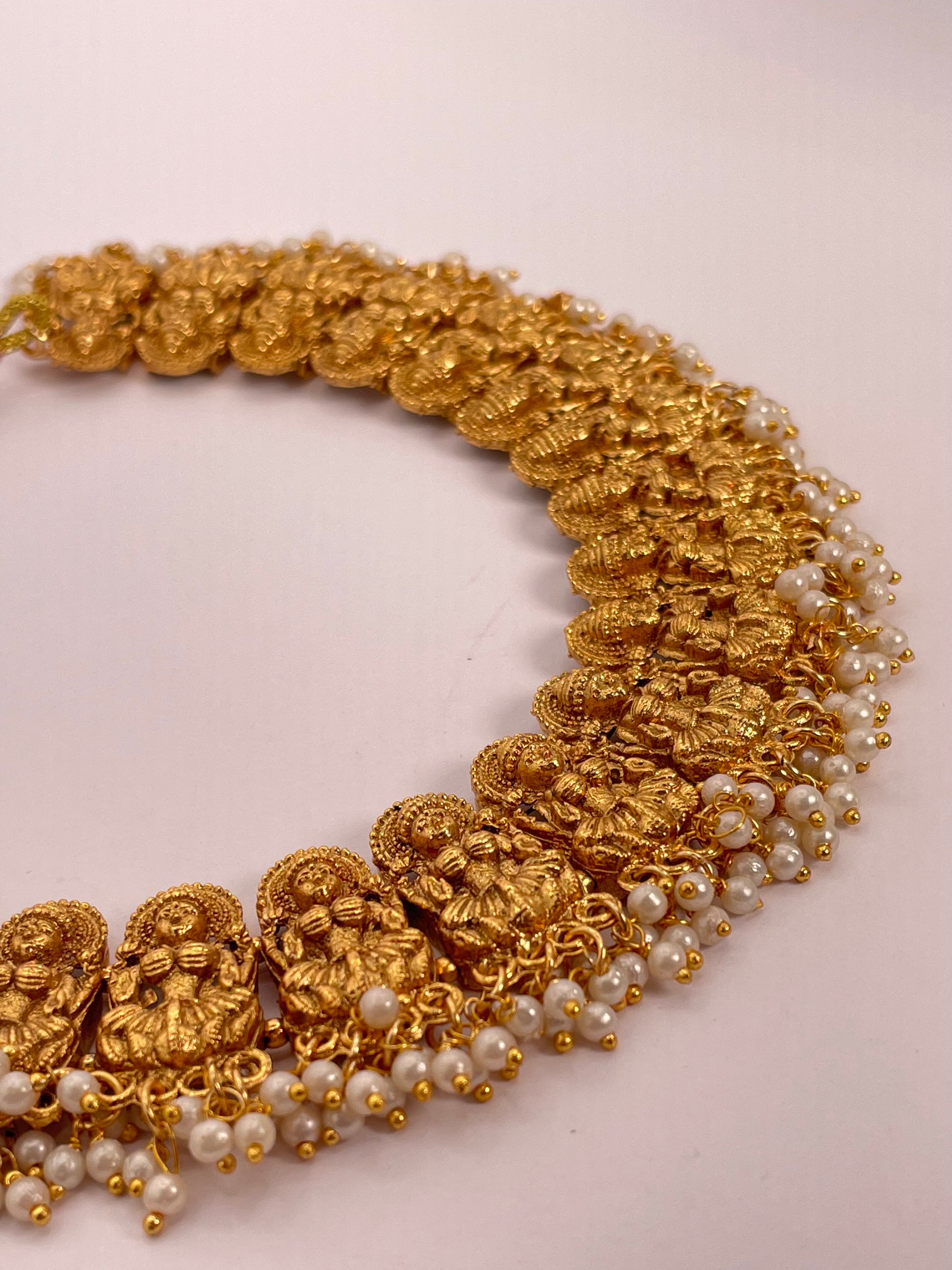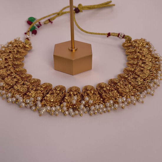 Anvitha radiates divine elegance with its shimmering gold-toned beads arranged in a graceful, goddess-inspired design. This necklace set is a perfect blend of tradition and sophistication, paired with matching earrings to complete a regal ensemble. Lightweight yet striking, Anvitha is ideal for festive occasions and special celebrations where you want to shine.