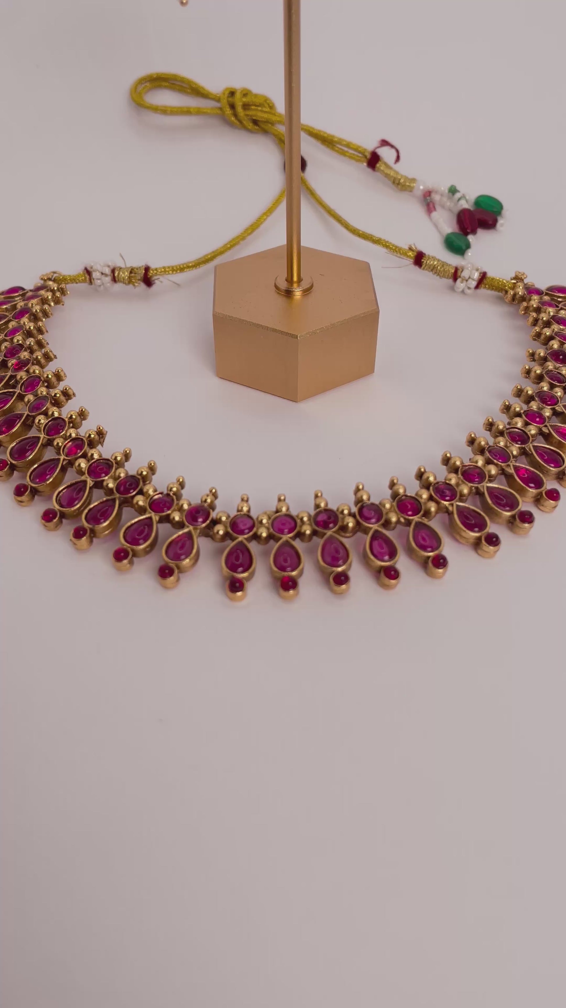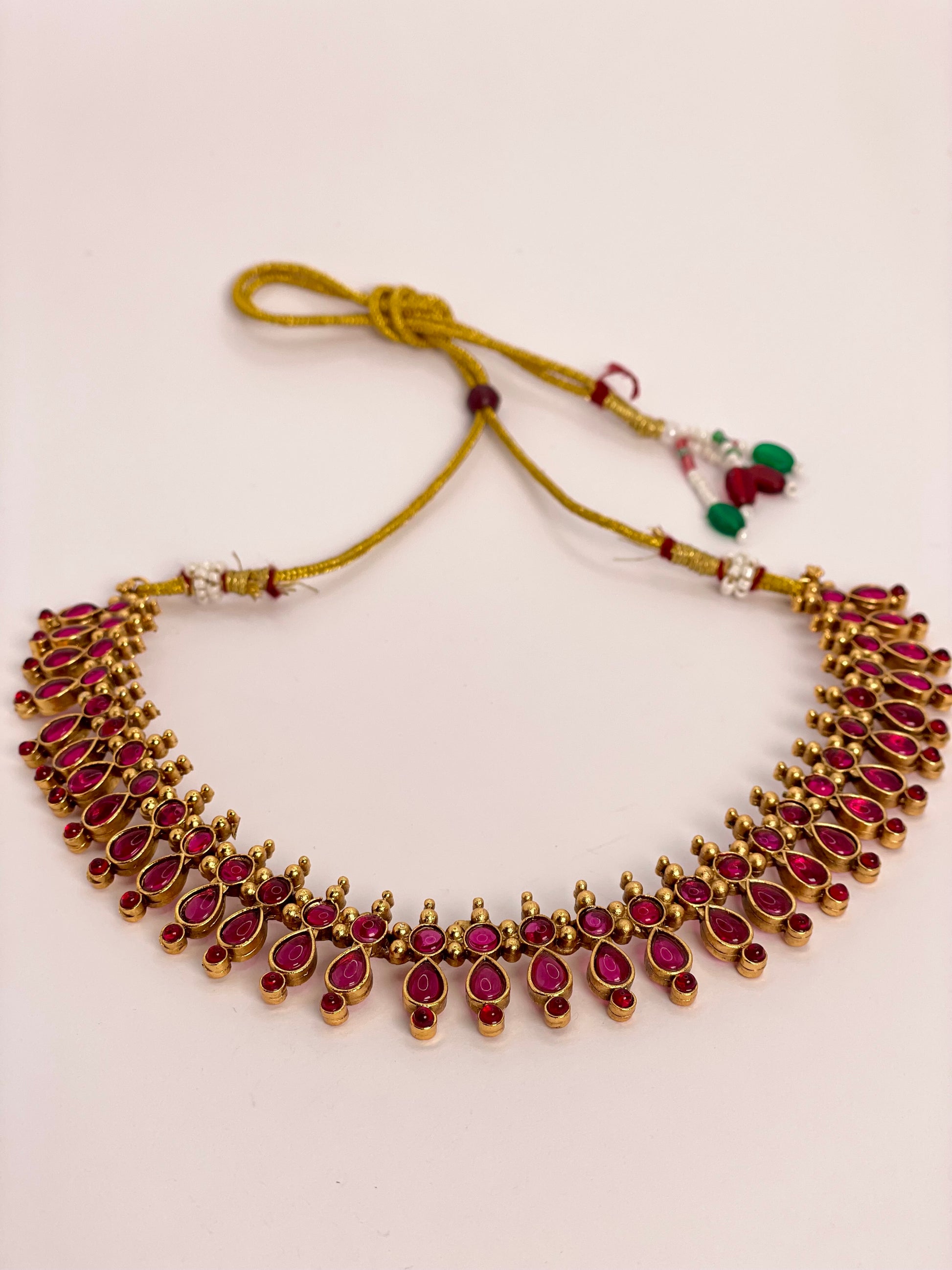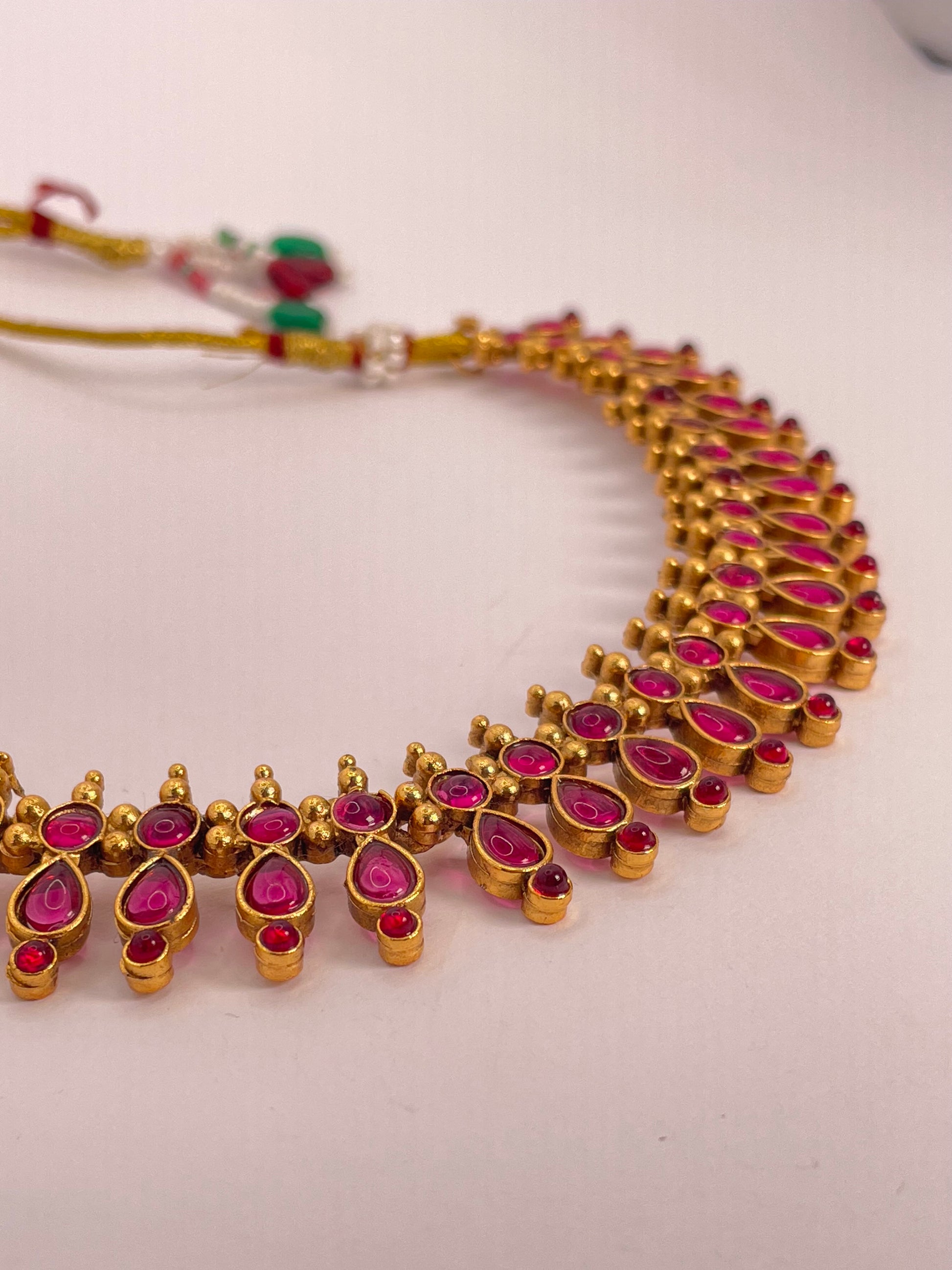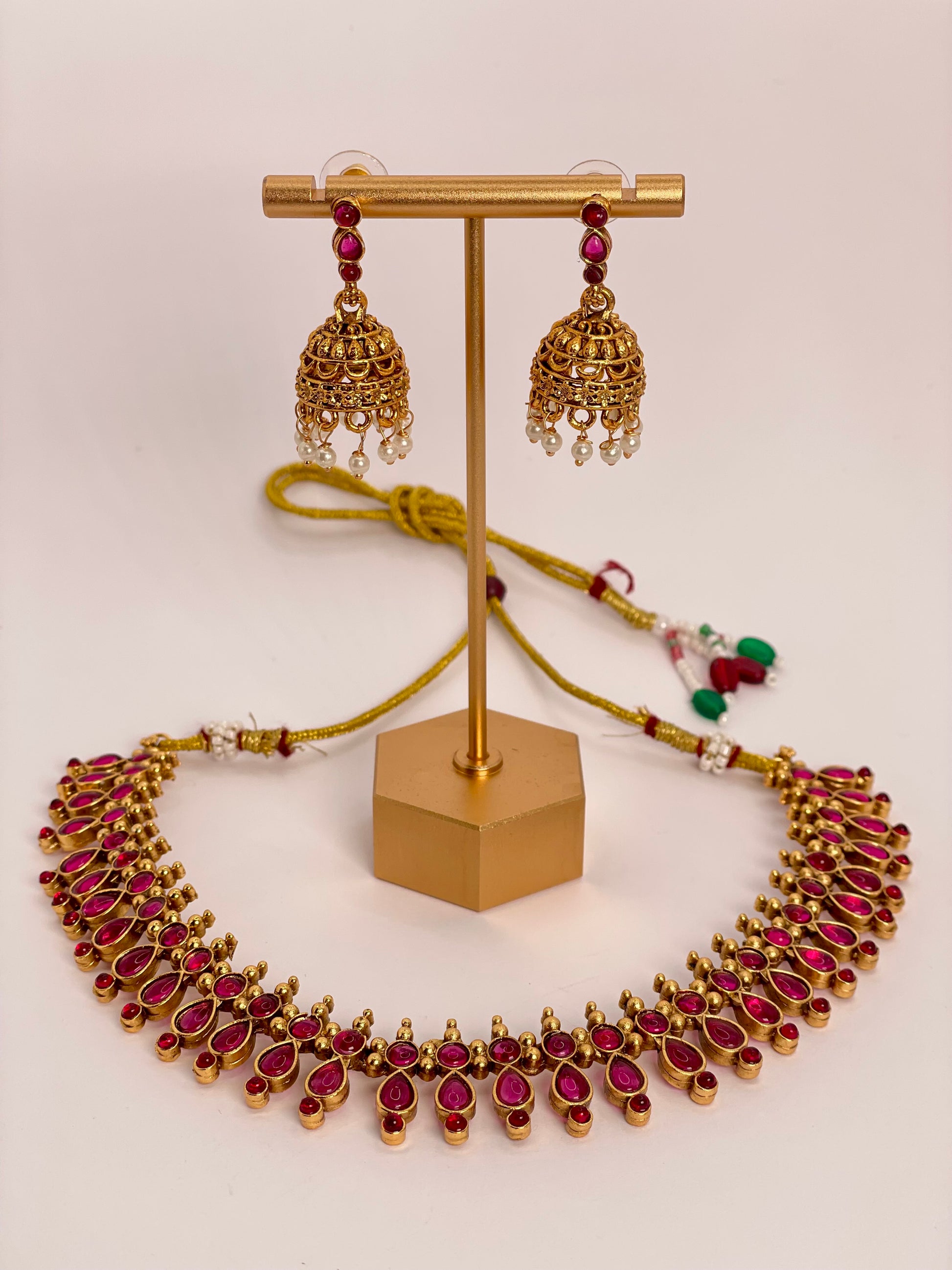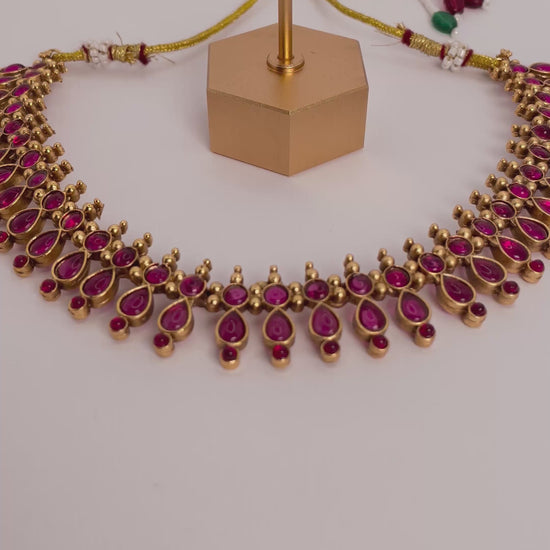 Charvini is a timeless statement of elegance, crafted with radiant ruby-red stones shaped in a graceful pear design. The refined arrangement creates a balance of sophistication and charm, while the coordinated earrings complete the set with effortless beauty. Charvini is designed to enhance both festive attire and modern traditional styles.