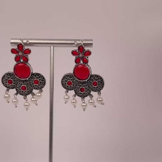 Oxidized silver earrings with red floral detail and pearls — bold yet timelessly Indian.