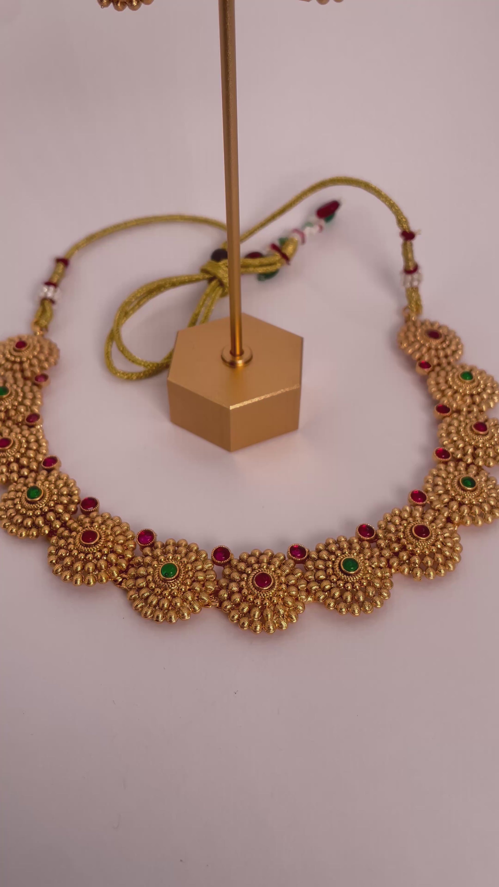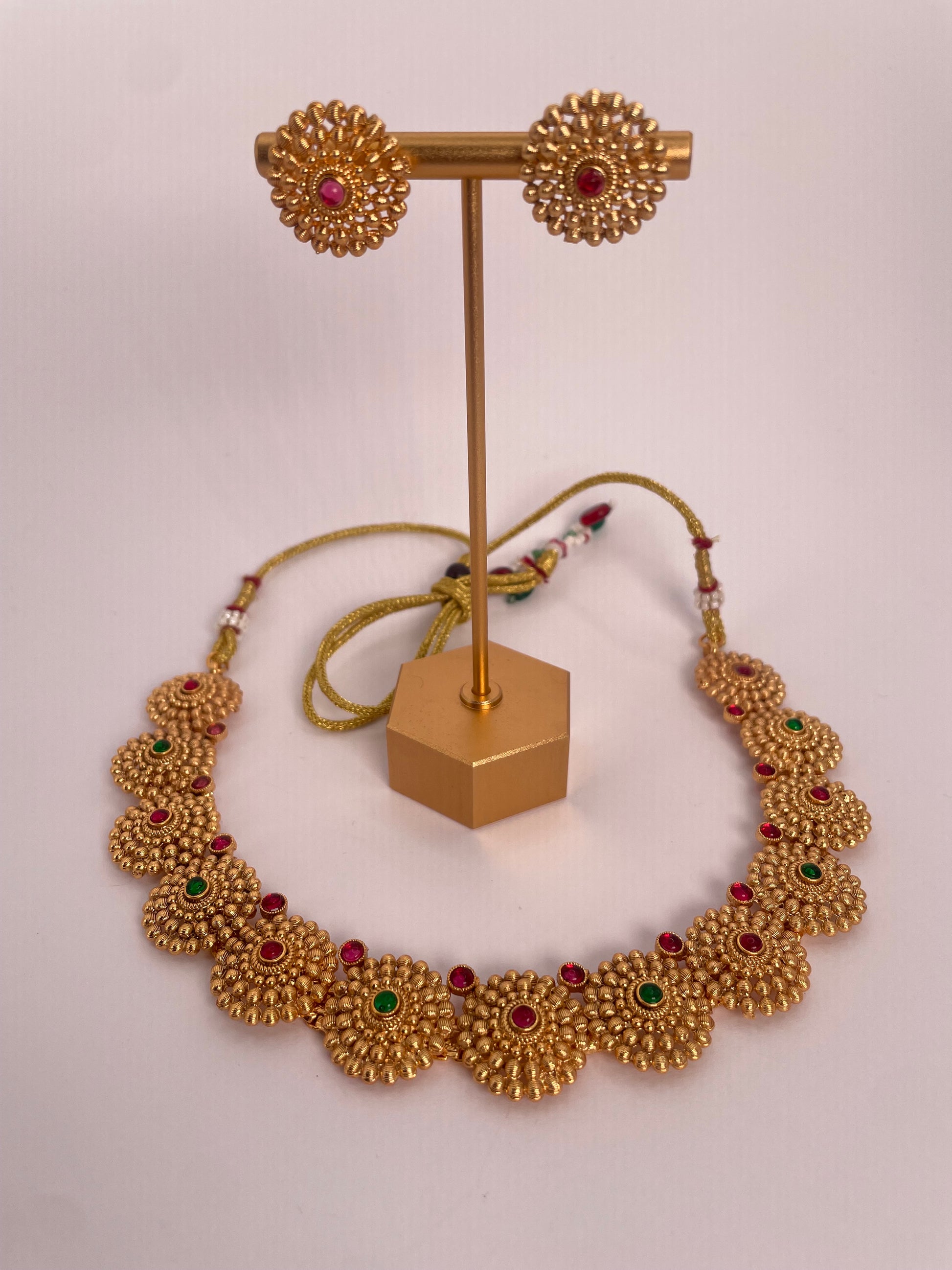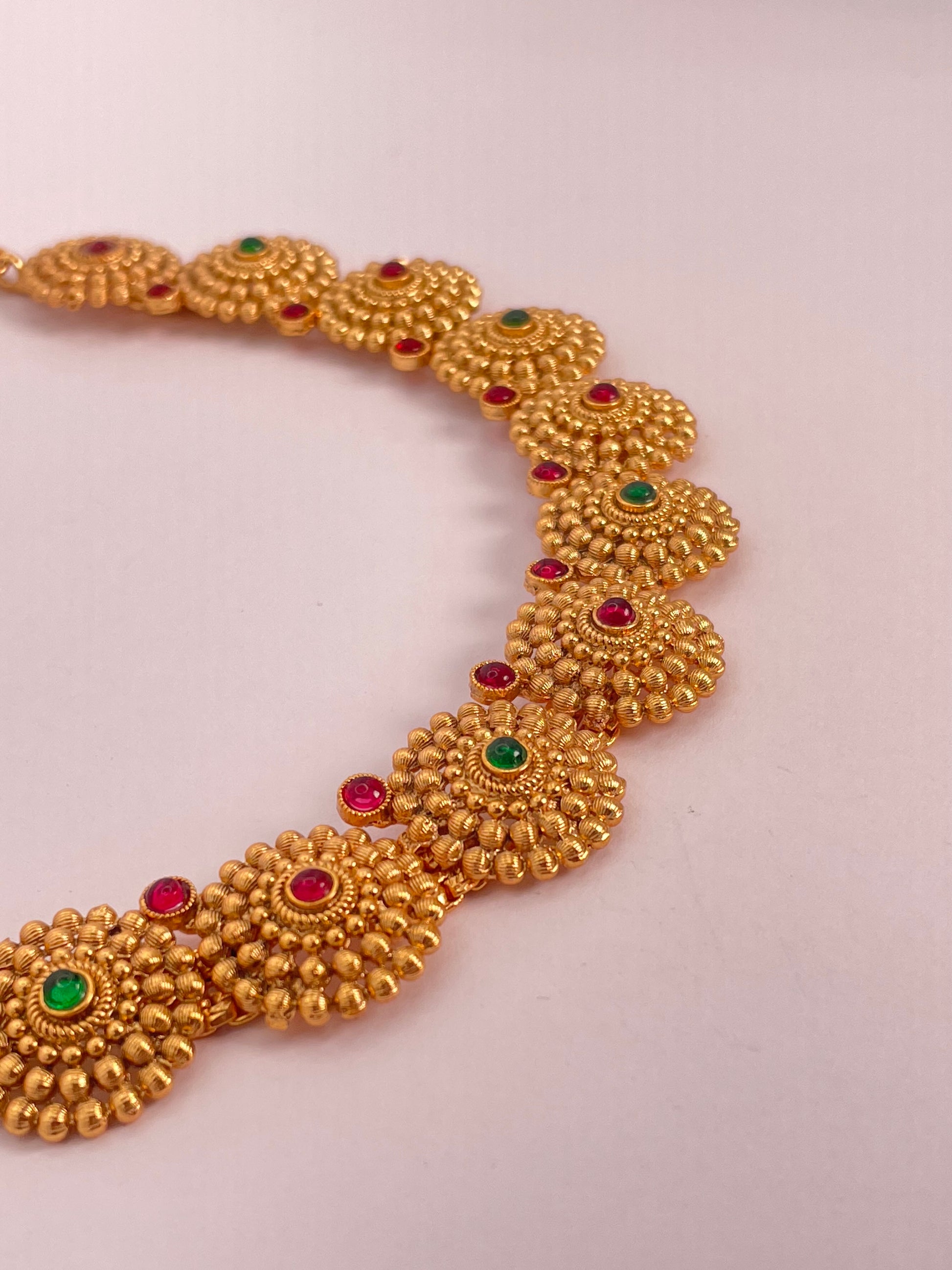 Prerana celebrates grandeur and festivity with a dazzling round firework design crafted from alternating emerald-green and ruby-red stones. The burst-like arrangement radiates brilliance, symbolizing joy and celebration, while the rich jewel tones bring out a regal charm. Paired with matching earrings, Prerana is a statement piece that instantly elevates any festive or bridal look.