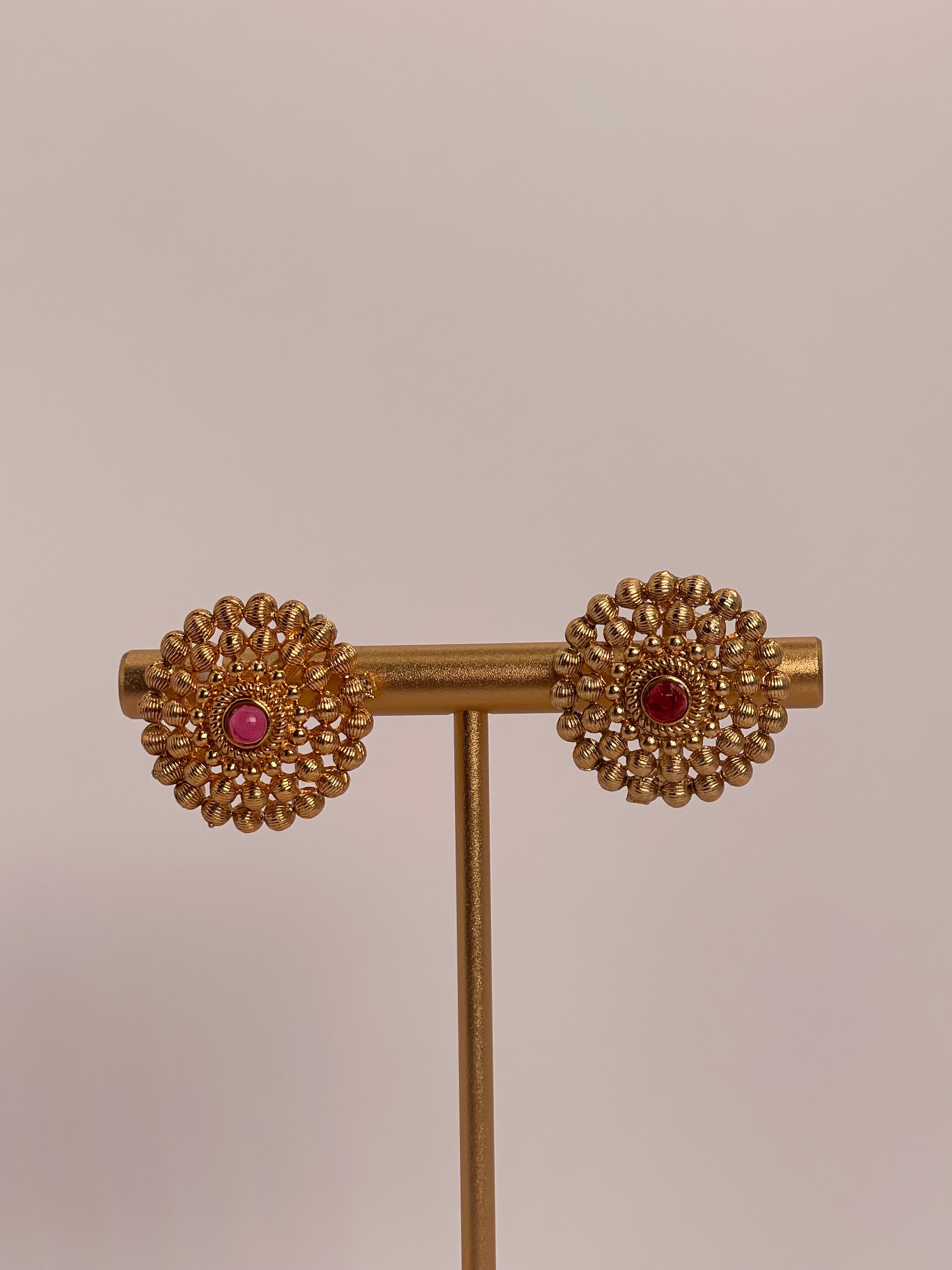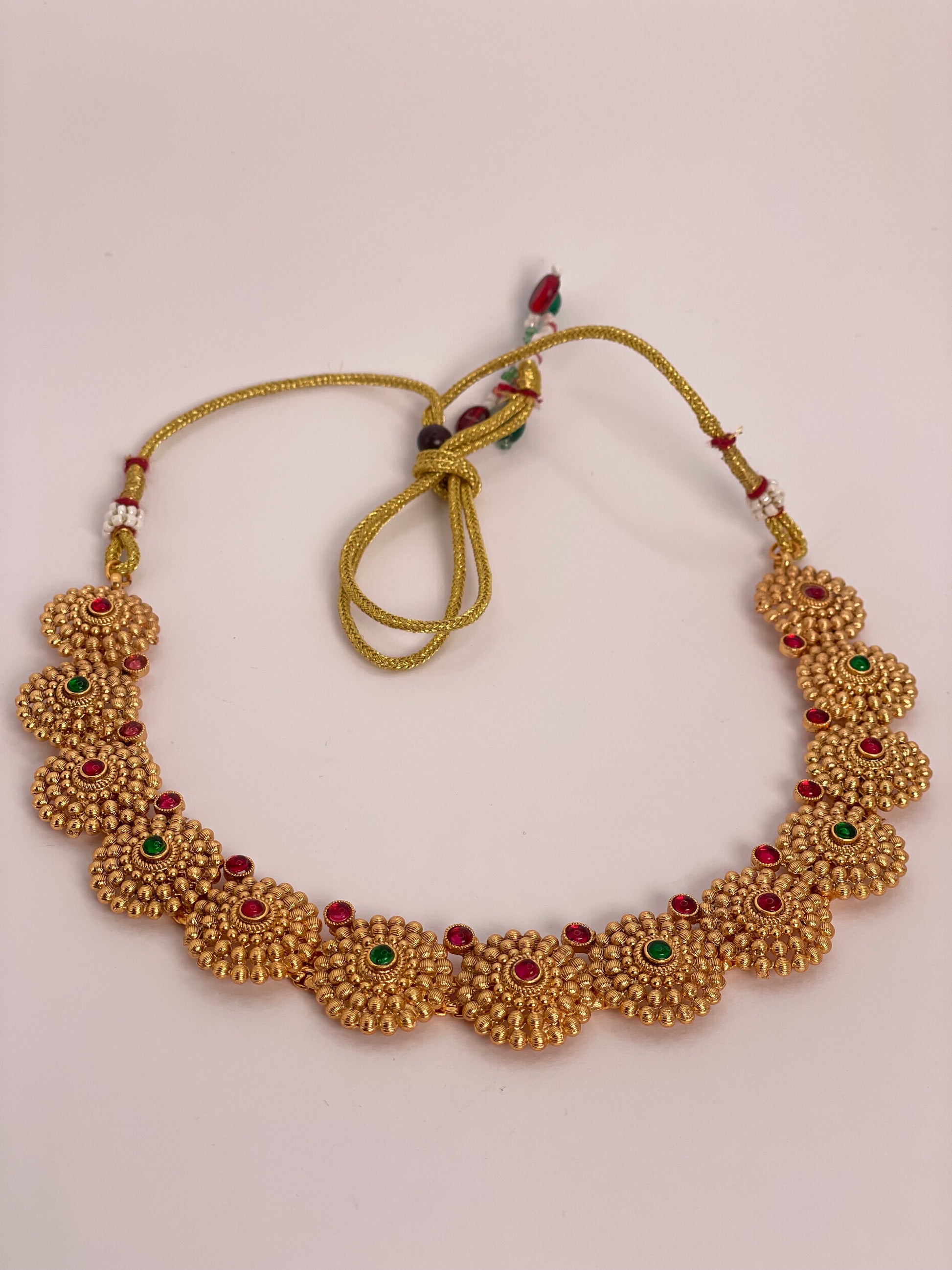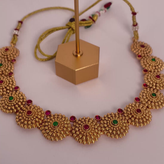 Prerana celebrates grandeur and festivity with a dazzling round firework design crafted from alternating emerald-green and ruby-red stones. The burst-like arrangement radiates brilliance, symbolizing joy and celebration, while the rich jewel tones bring out a regal charm. Paired with matching earrings, Prerana is a statement piece that instantly elevates any festive or bridal look.