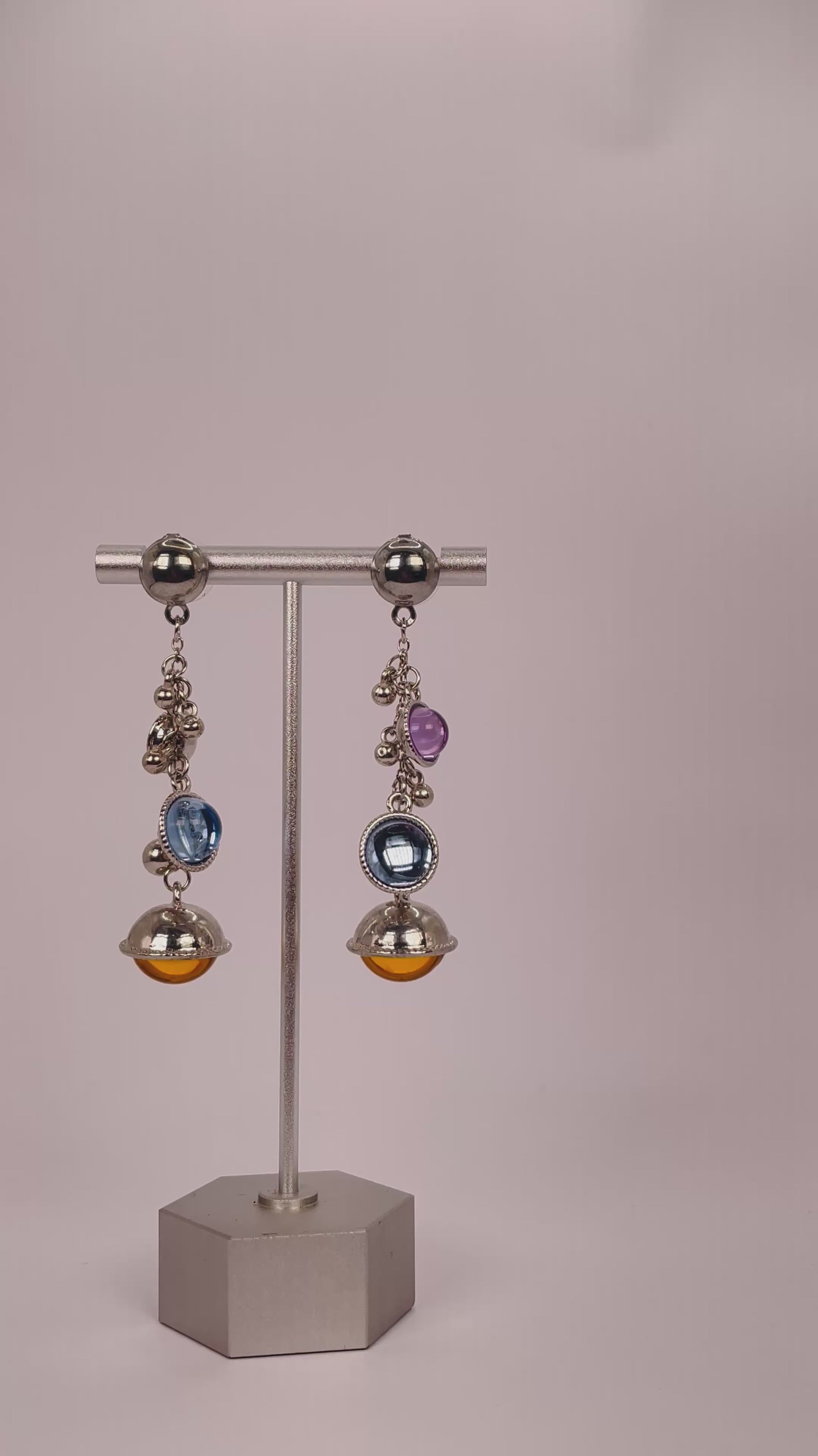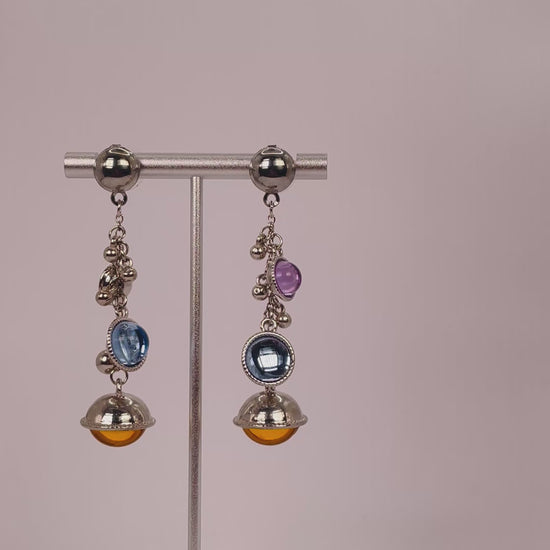 Lilac, blue, and orange bead earrings in silver — colorful elegance with a cool tone.