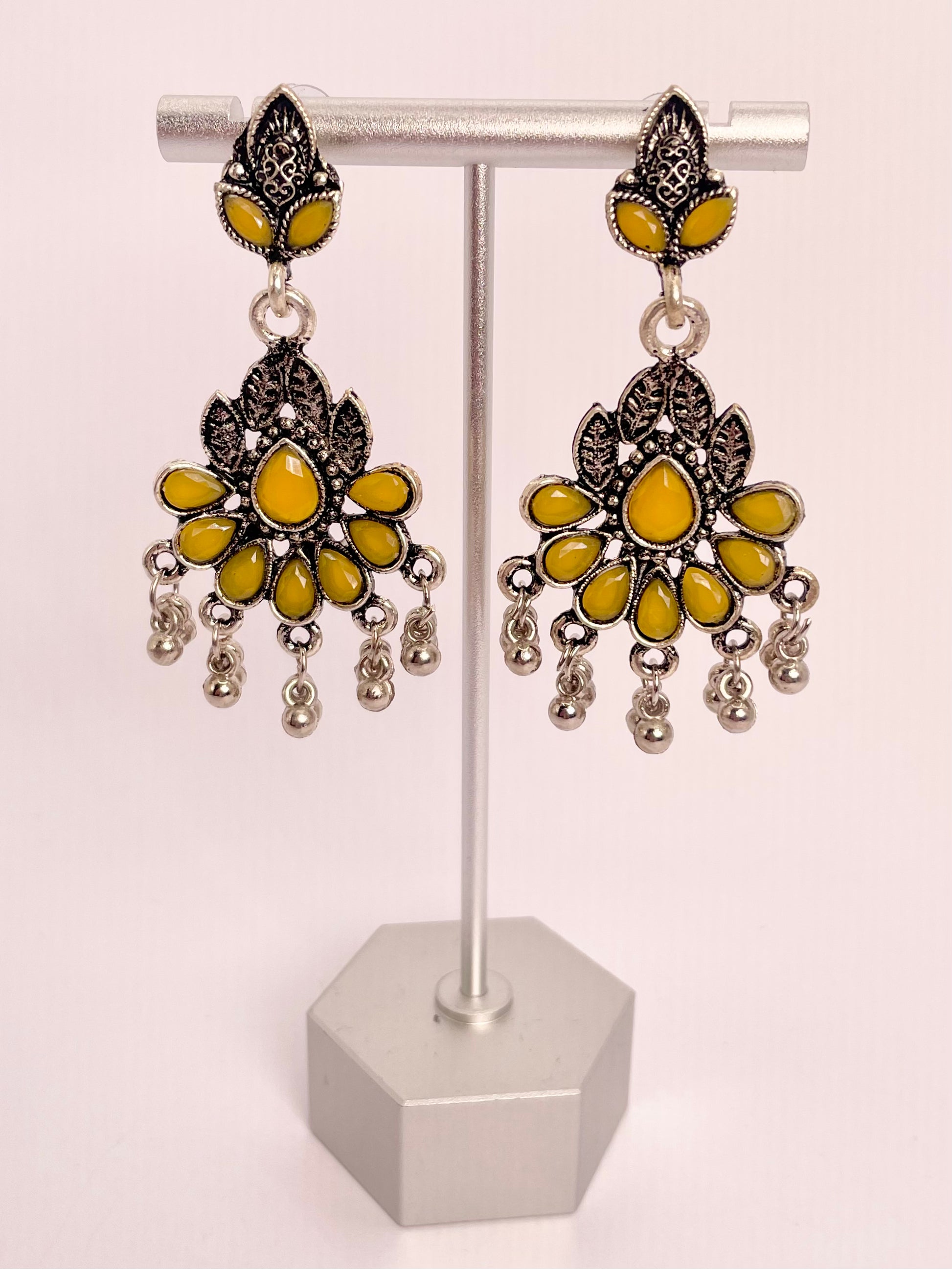 Elegant and traditional, the Oxidized Yellow Pear Earring features a pear-shaped design accented with bright yellow details and a vintage oxidized finish. A graceful piece that adds festive charm and cultural elegance to special occasions.