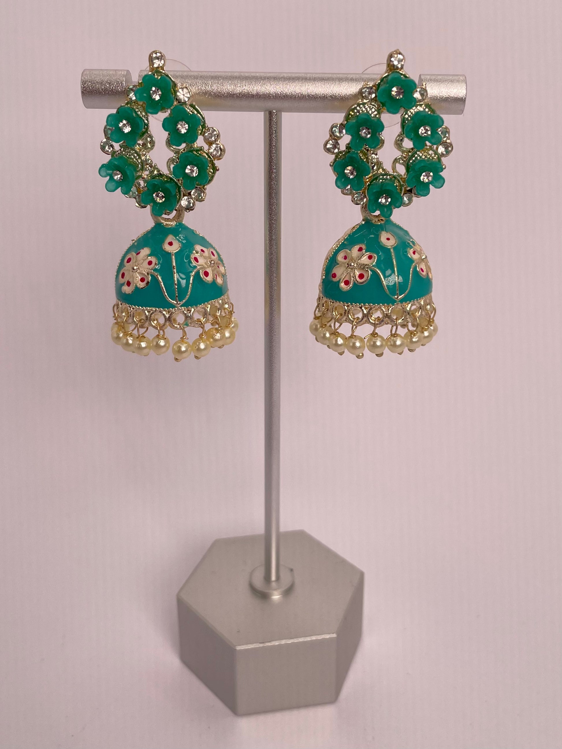 Elegant and artistic, the Teal Floral Painted Jhumka Earring features hand-painted floral detailing in refreshing teal tones. A graceful piece that blends tradition with creativity, perfect for adding charm to festive and special occasions.