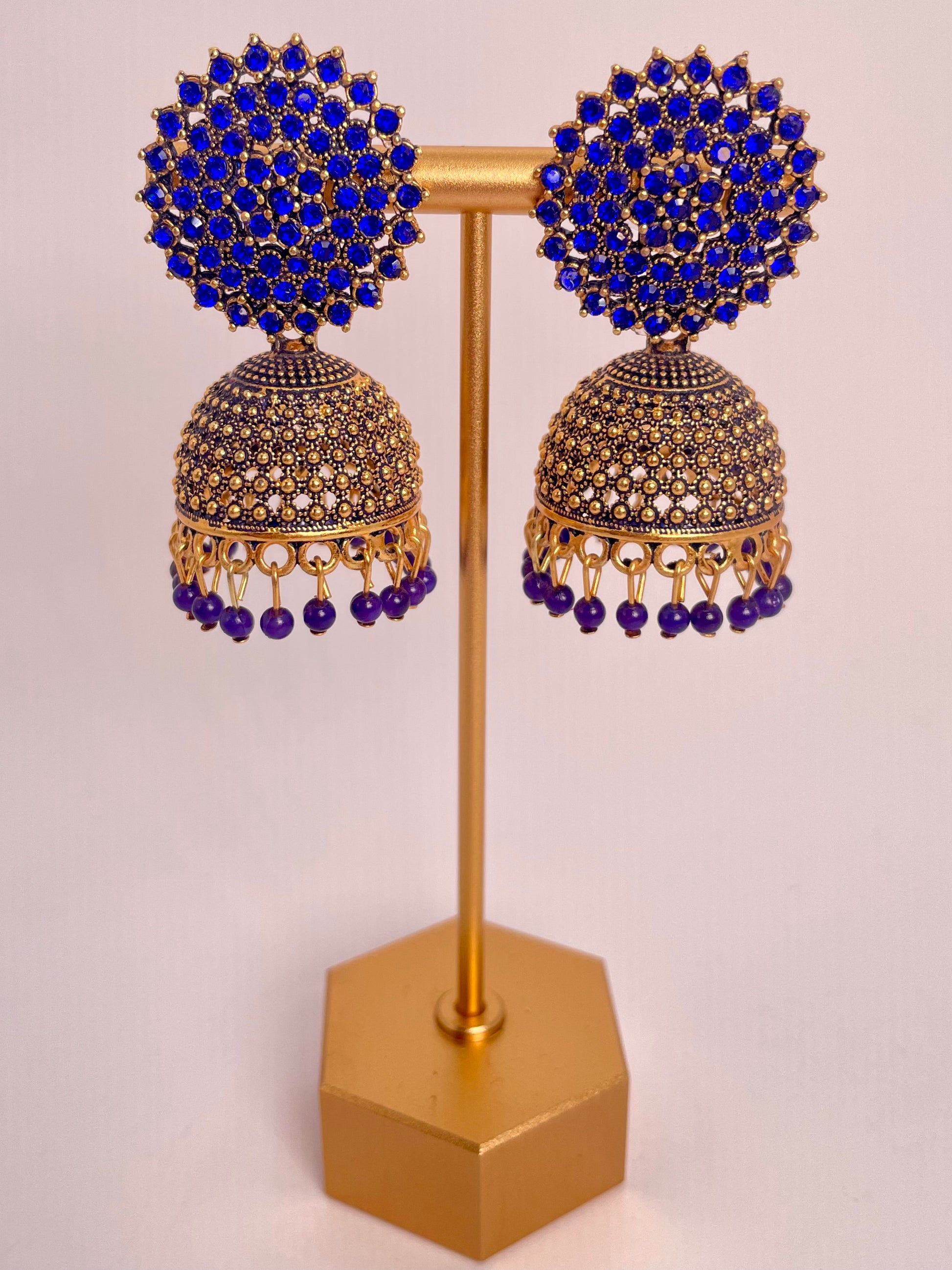 Bold and elegant, the Royal Blue Gold Jimka Earring features striking royal blue accents set in a classic gold jimka design. A festive statement piece that adds richness, tradition, and sophistication to special occasions.
