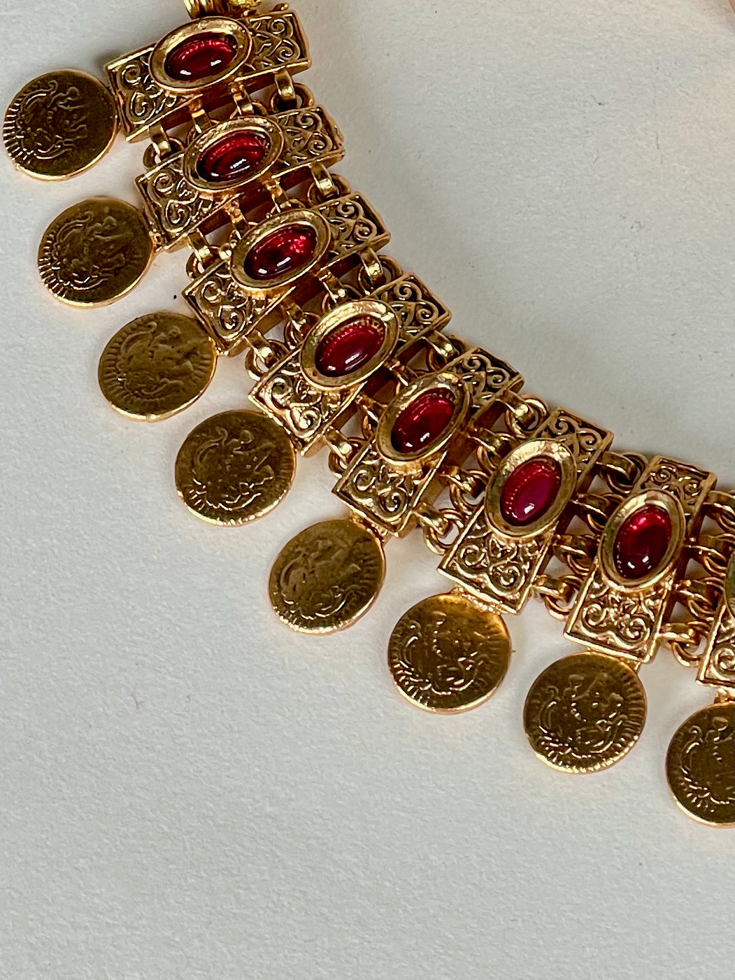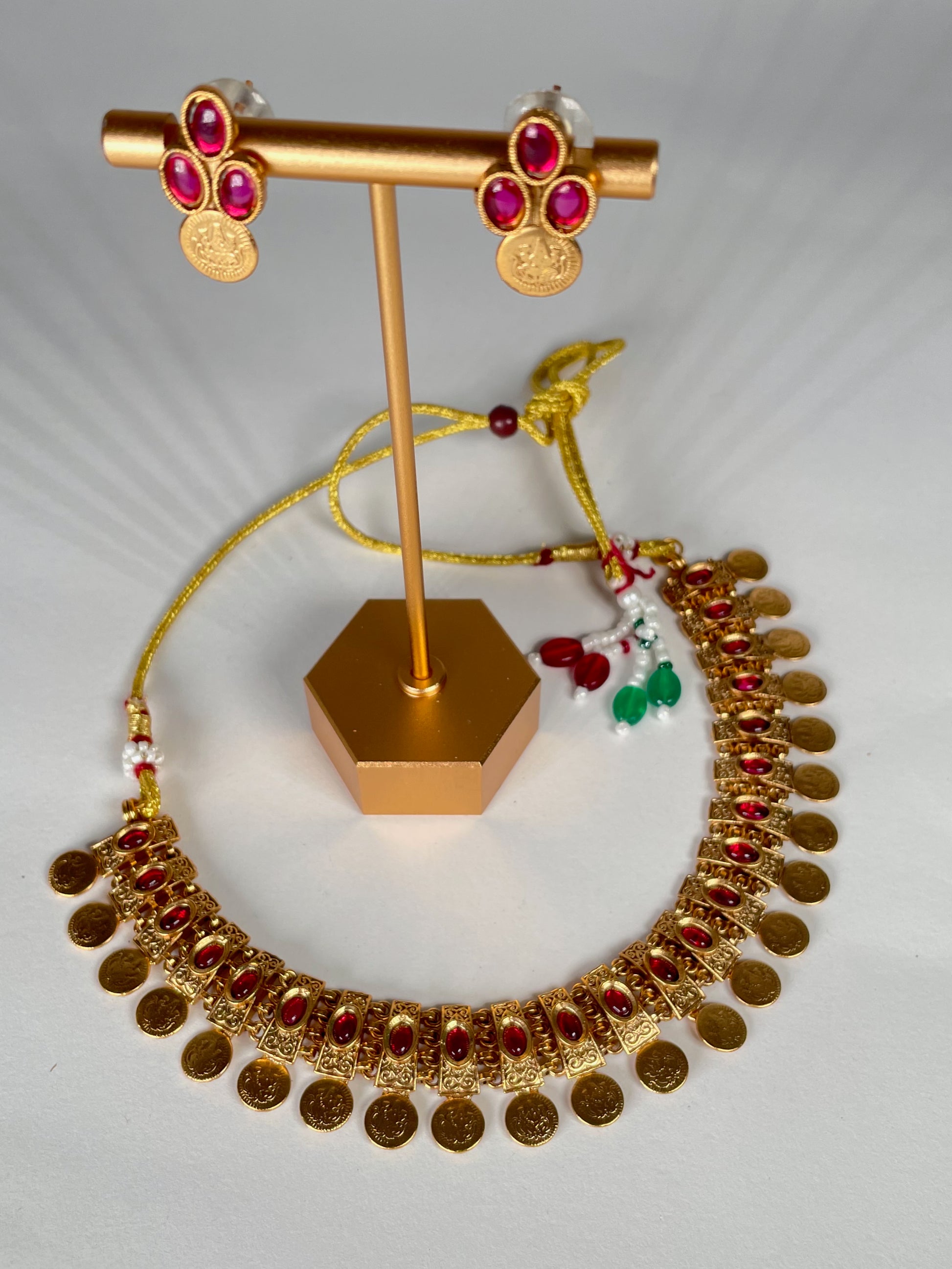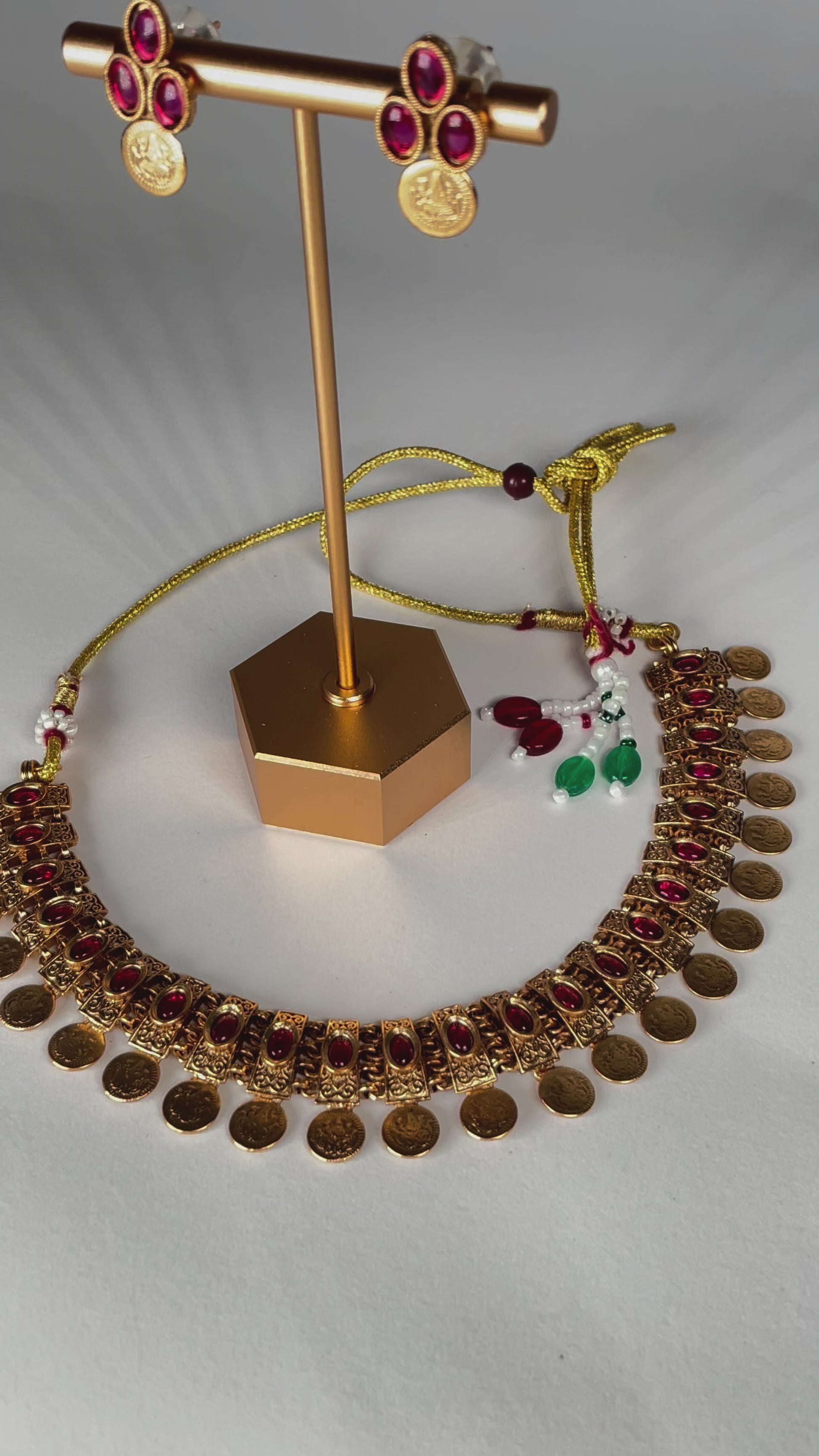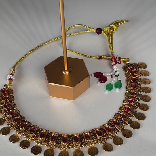 Sanjhika is a Ruby Stone Gold Antique Necklace Set that glows with vintage elegance and passionate warmth. The deep ruby stones shine brilliantly against the intricately crafted antique gold, creating a timeless statement of grace and sophistication. Perfect for special occasions that call for regal charm, Sanjhika adds a radiant touch of tradition and bold beauty to every moment.