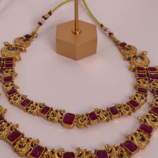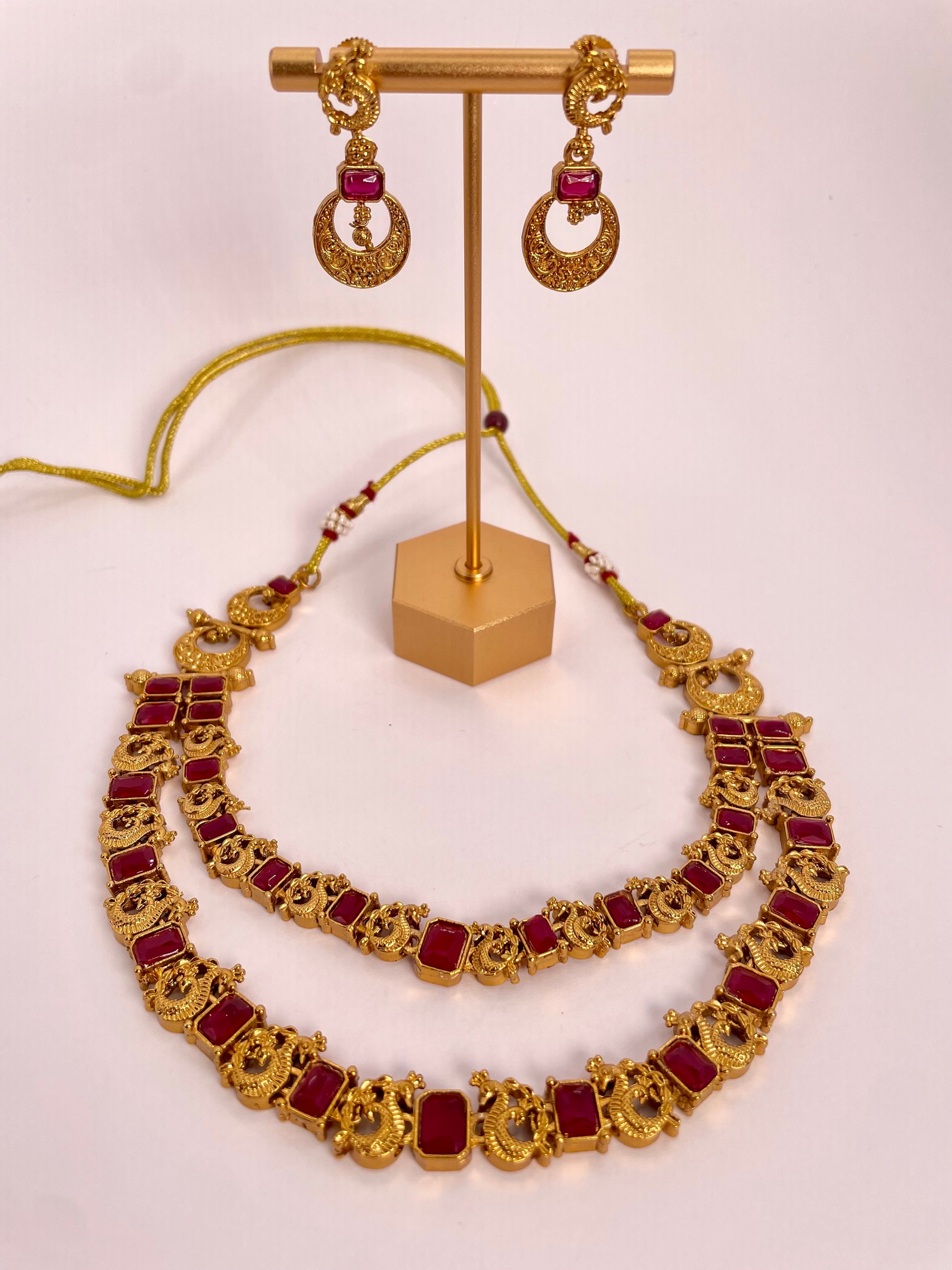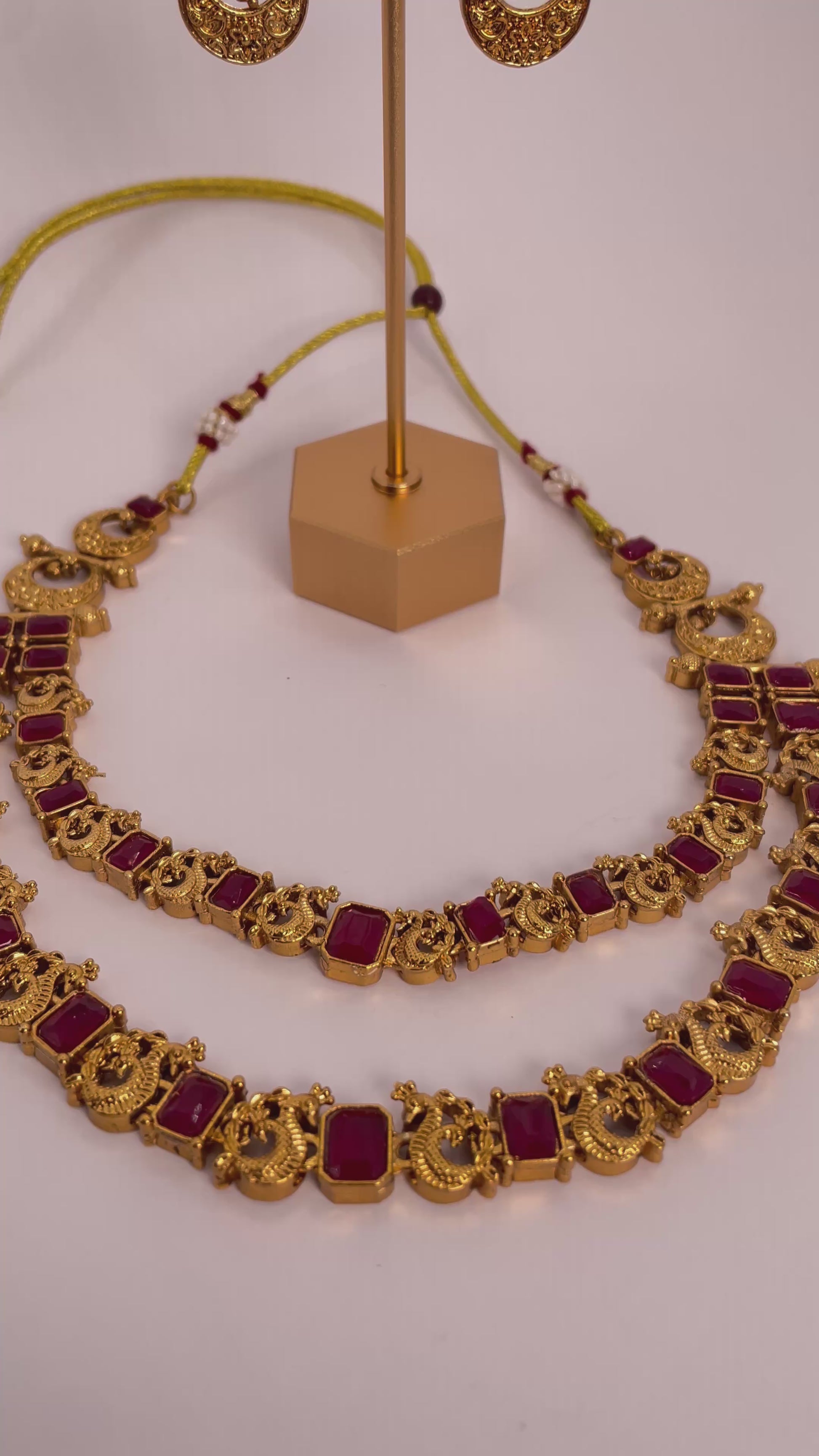 Vina is a sophisticated two-layered necklace set featuring ruby-red stones arranged in a modern square motif. The layered design adds dimension and elegance, while the matching earrings complete the ensemble with a refined touch. Lightweight and handcrafted, Vina is perfect for festive occasions, weddings, or cultural gatherings.