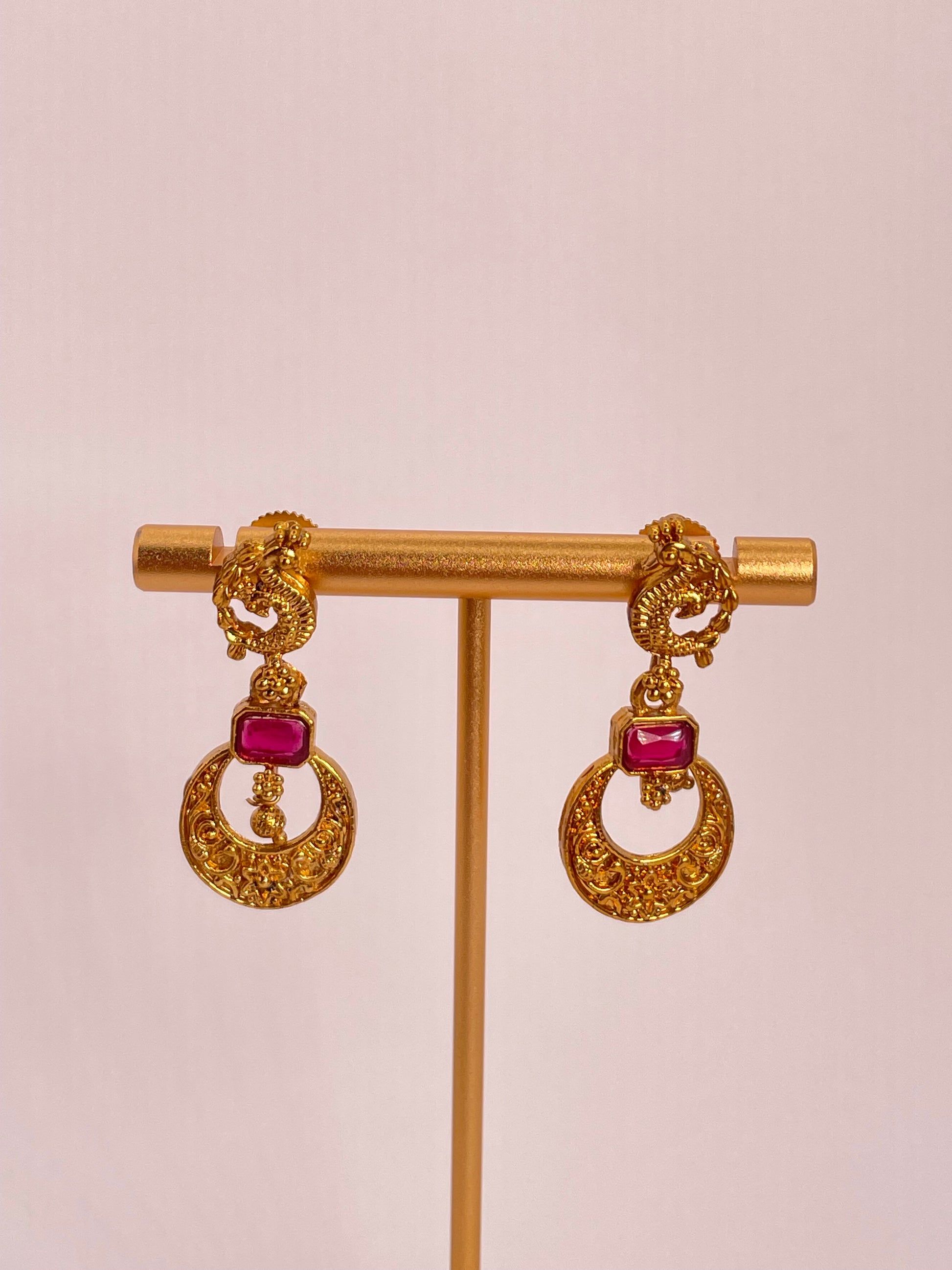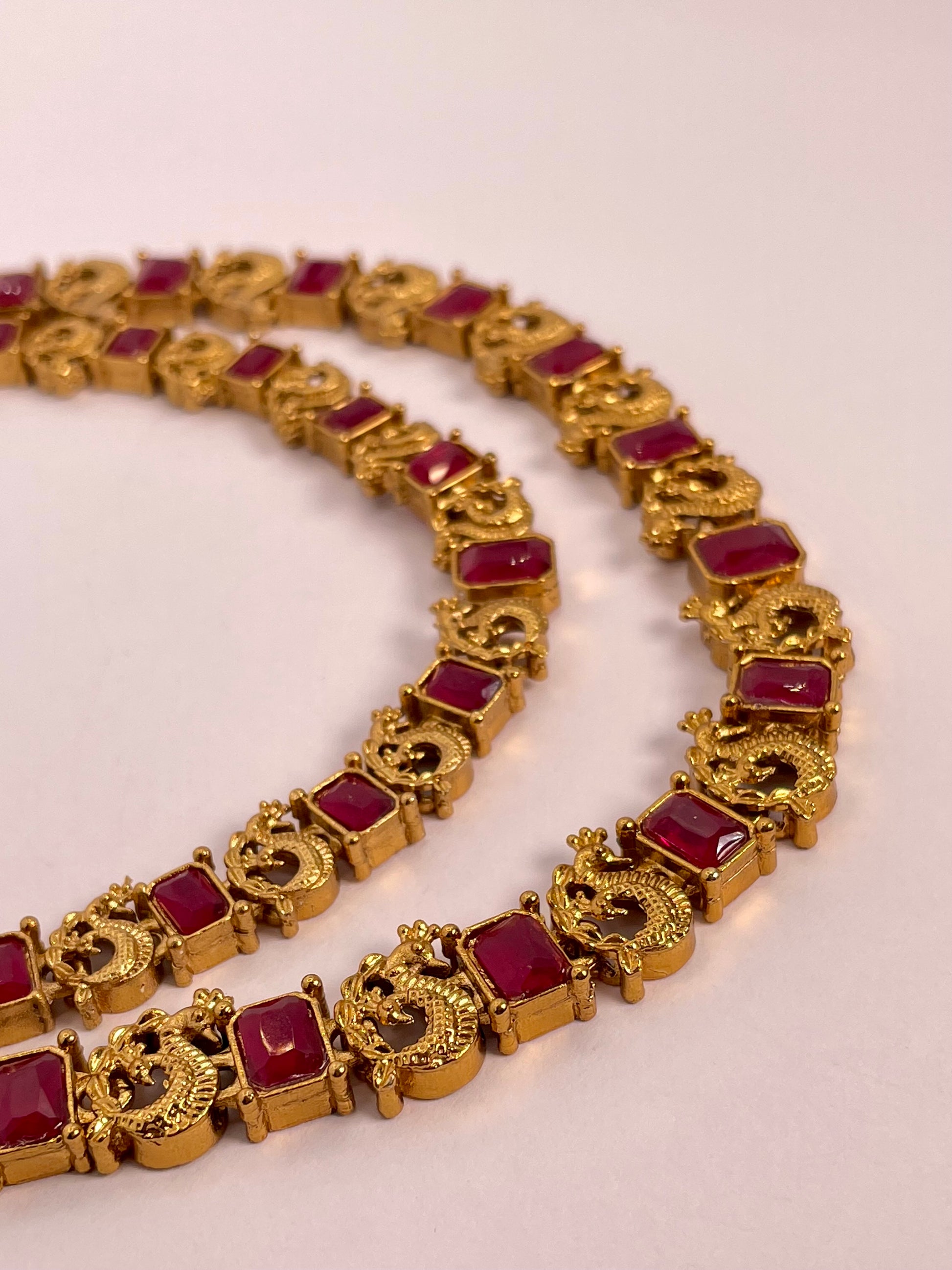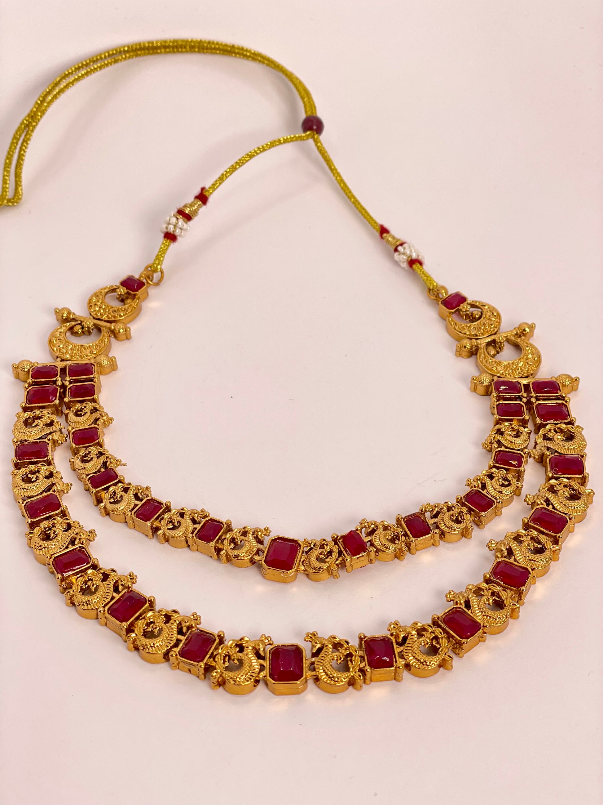 Vina is a sophisticated two-layered necklace set featuring ruby-red stones arranged in a modern square motif. The layered design adds dimension and elegance, while the matching earrings complete the ensemble with a refined touch. Lightweight and handcrafted, Vina is perfect for festive occasions, weddings, or cultural gatherings.