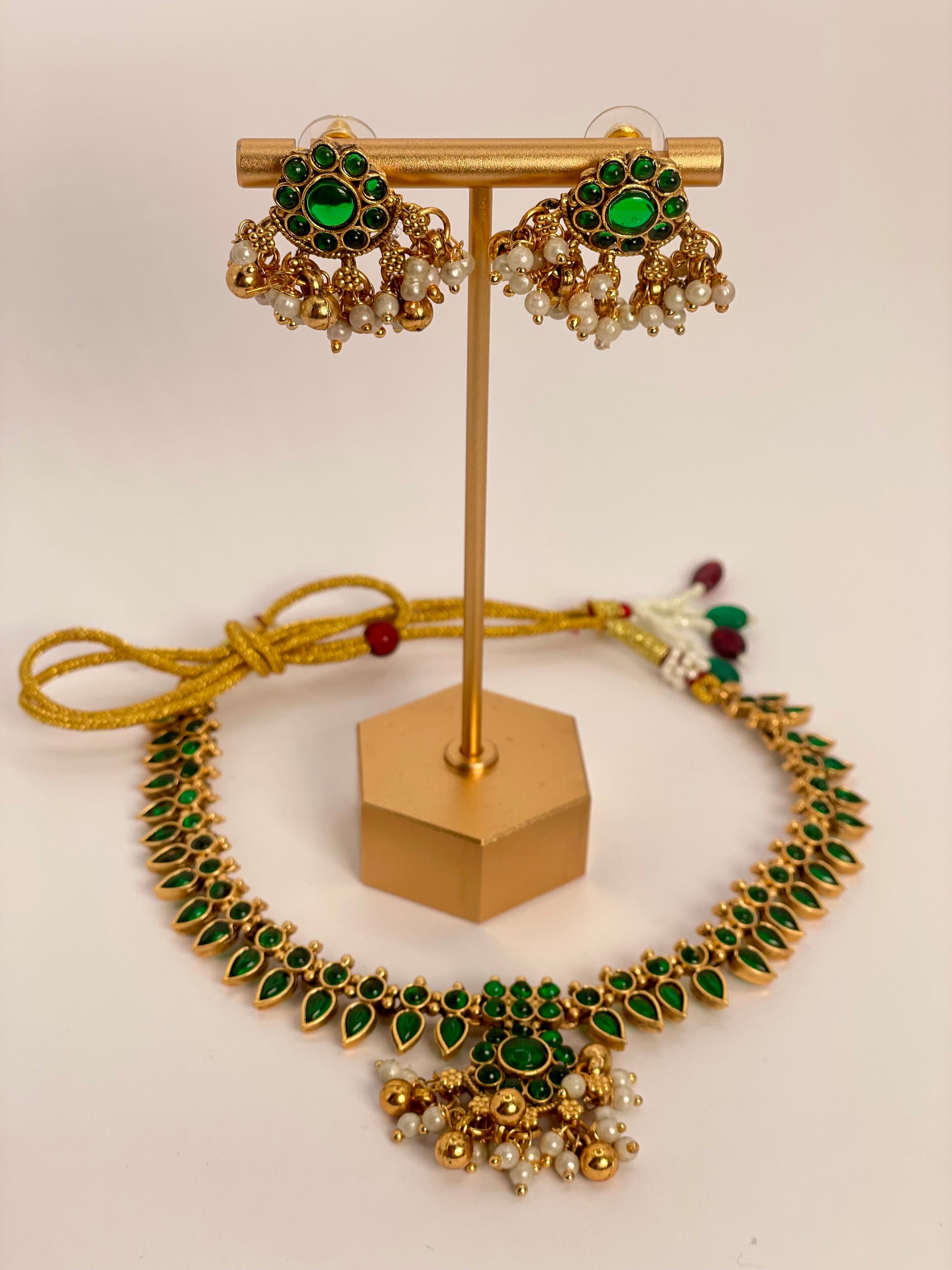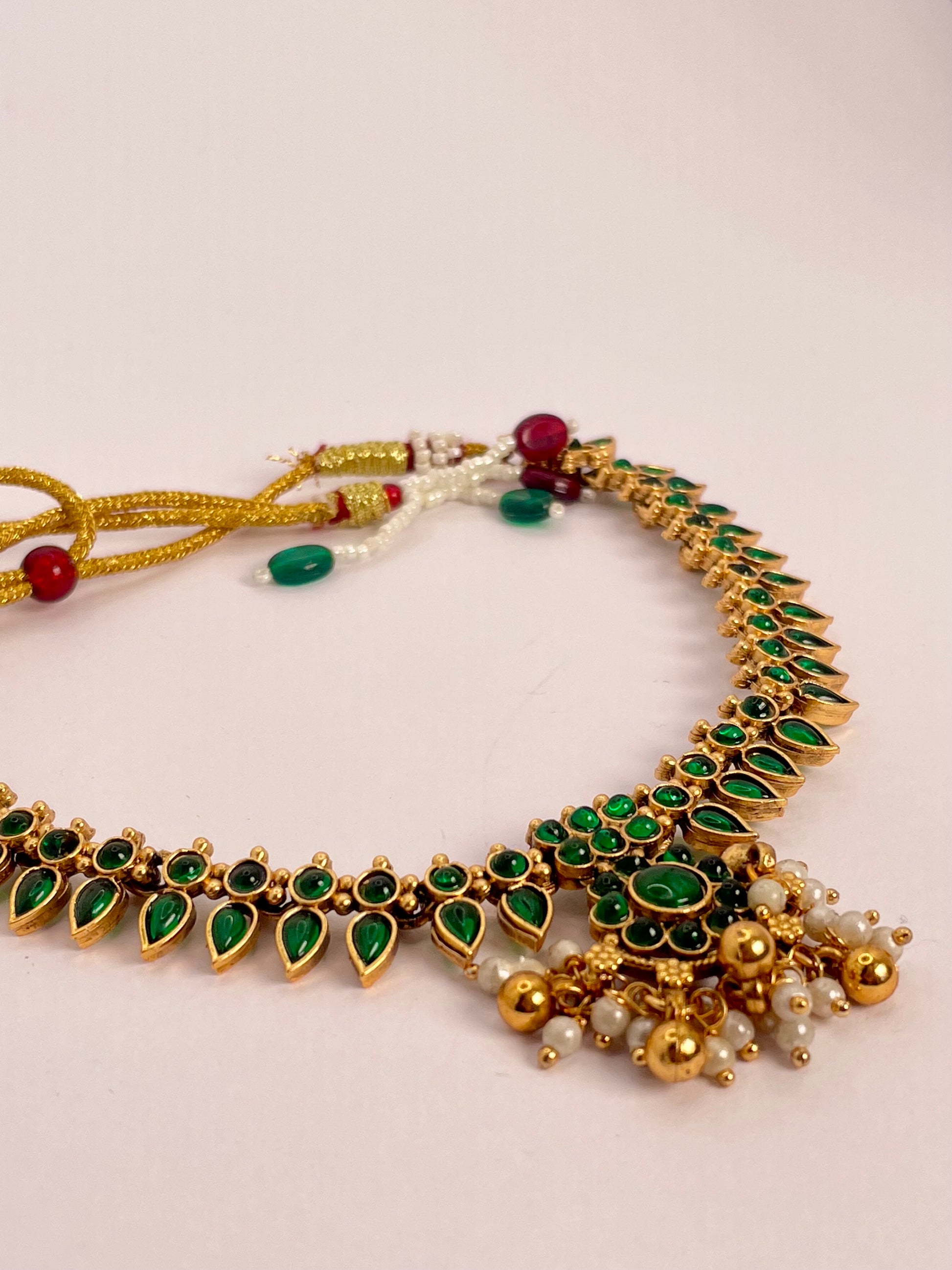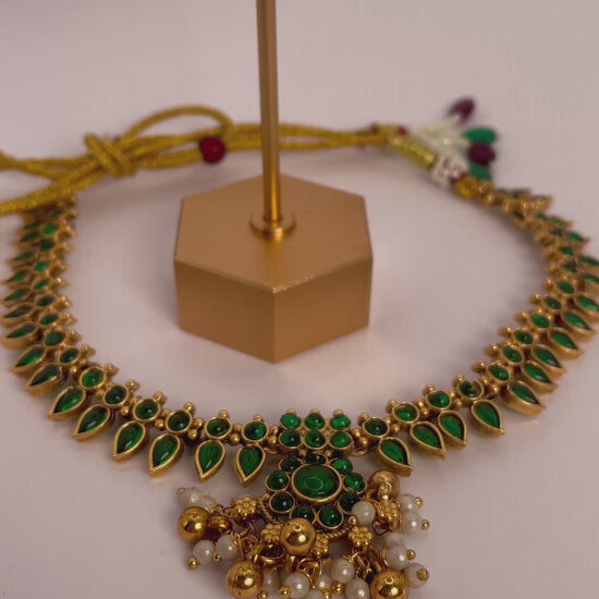 A stunning blend of elegance and tradition, this necklace set features rich emerald green beads delicately strung together, highlighted with a lotus-inspired pendant that symbolizes purity and grace. Perfectly paired with matching earrings, this set is designed to complement ethnic wear and elevate festive or wedding looks.