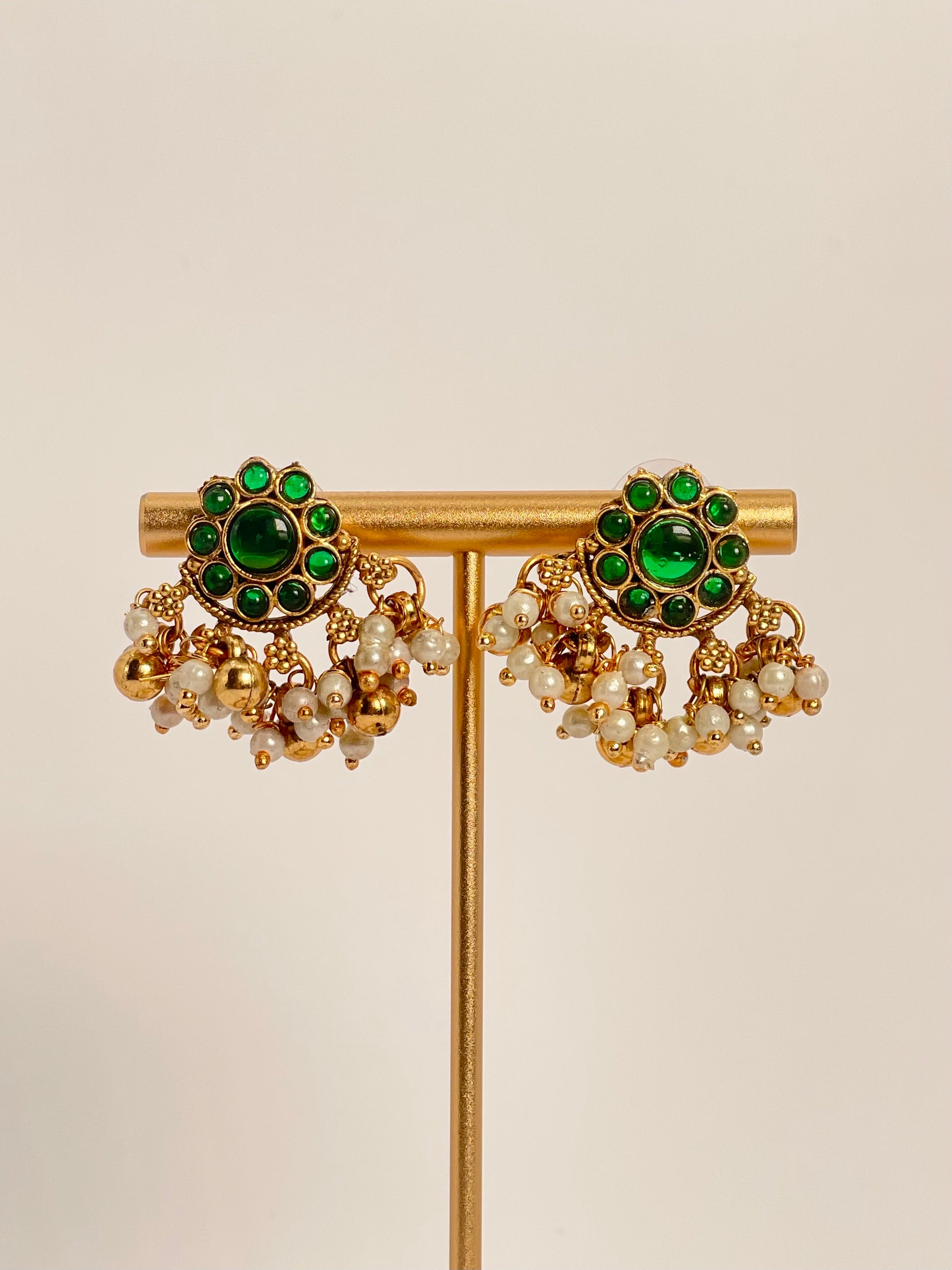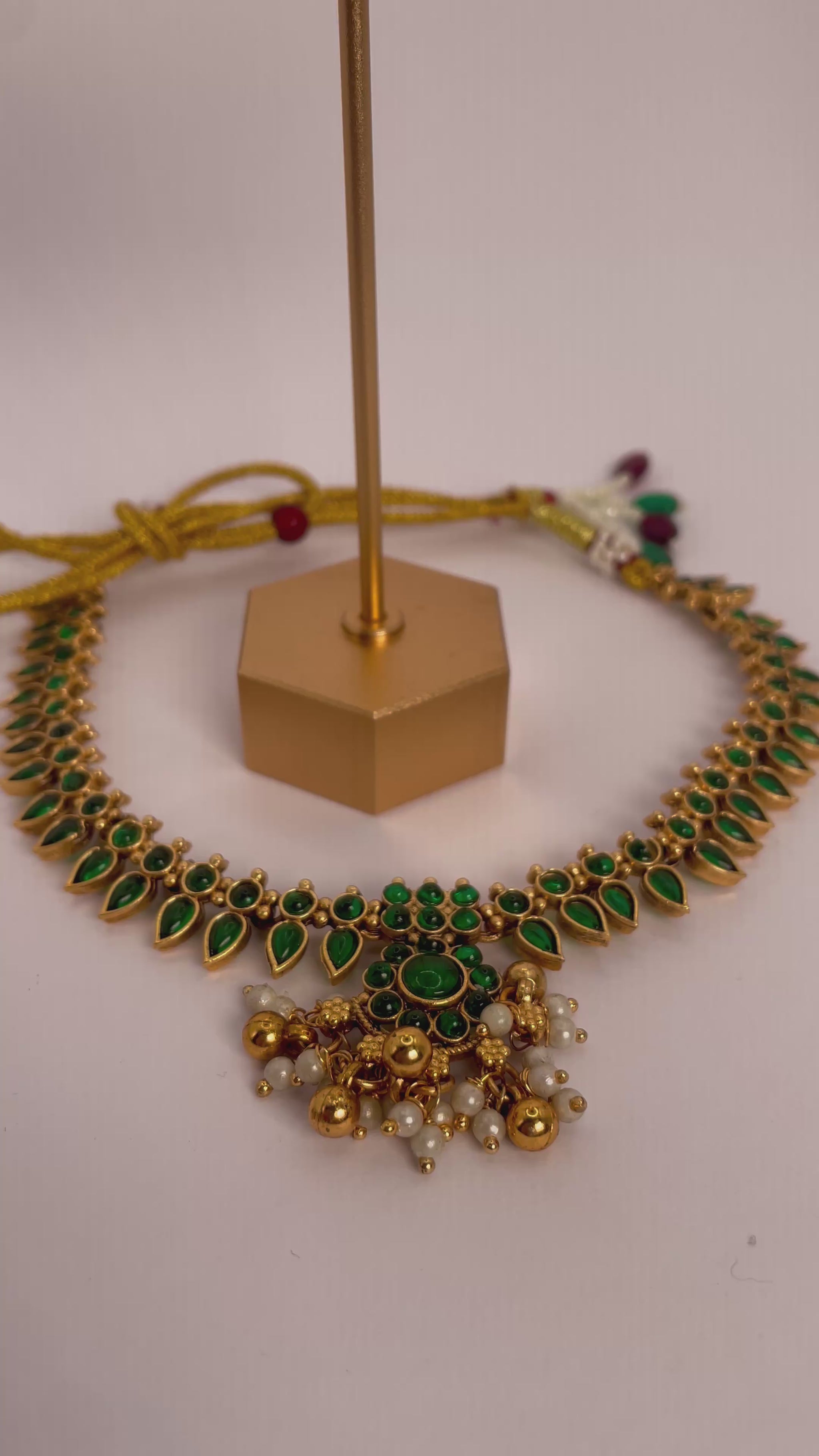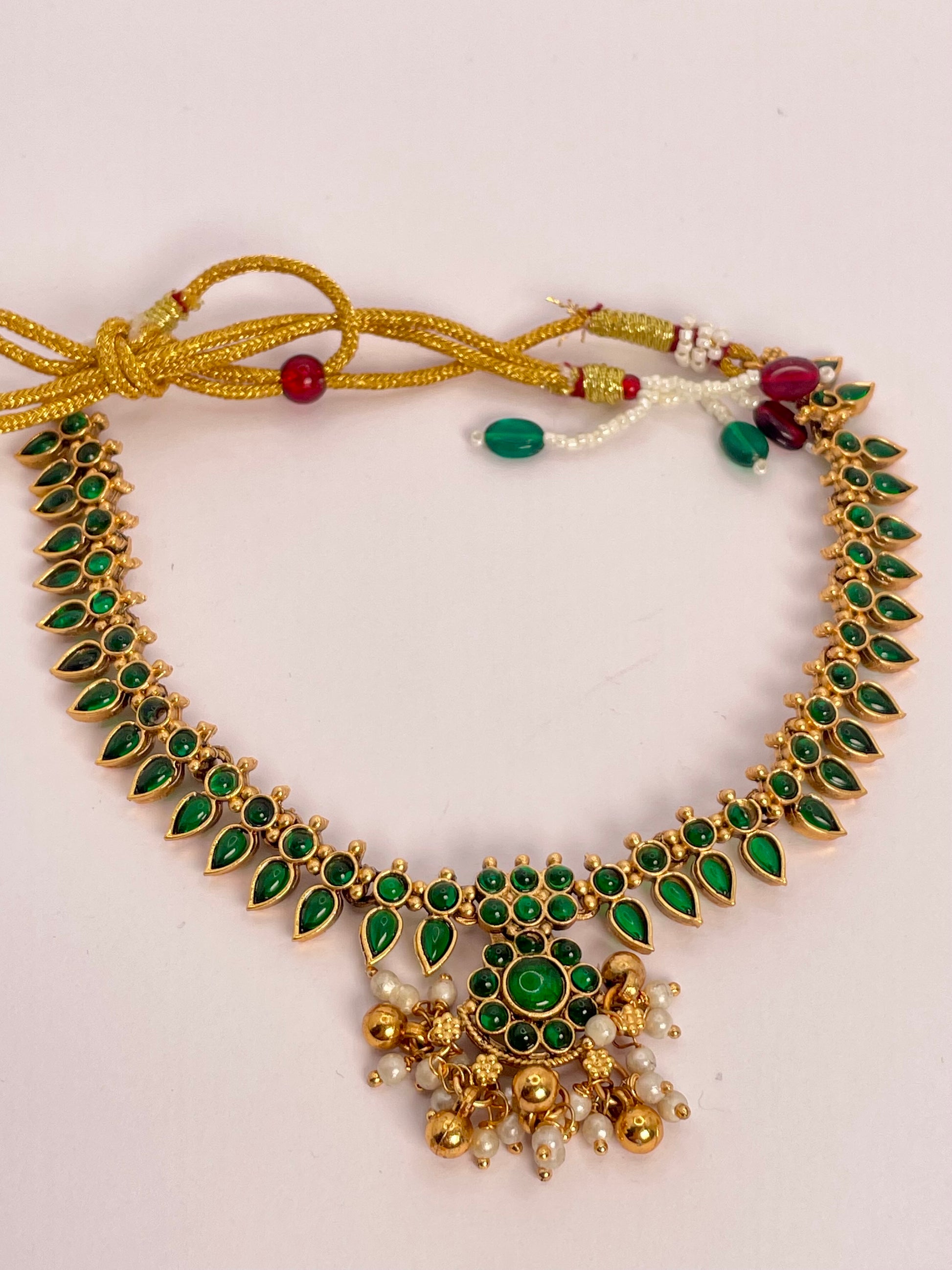A stunning blend of elegance and tradition, this necklace set features rich emerald green beads delicately strung together, highlighted with a lotus-inspired pendant that symbolizes purity and grace. Perfectly paired with matching earrings, this set is designed to complement ethnic wear and elevate festive or wedding looks.